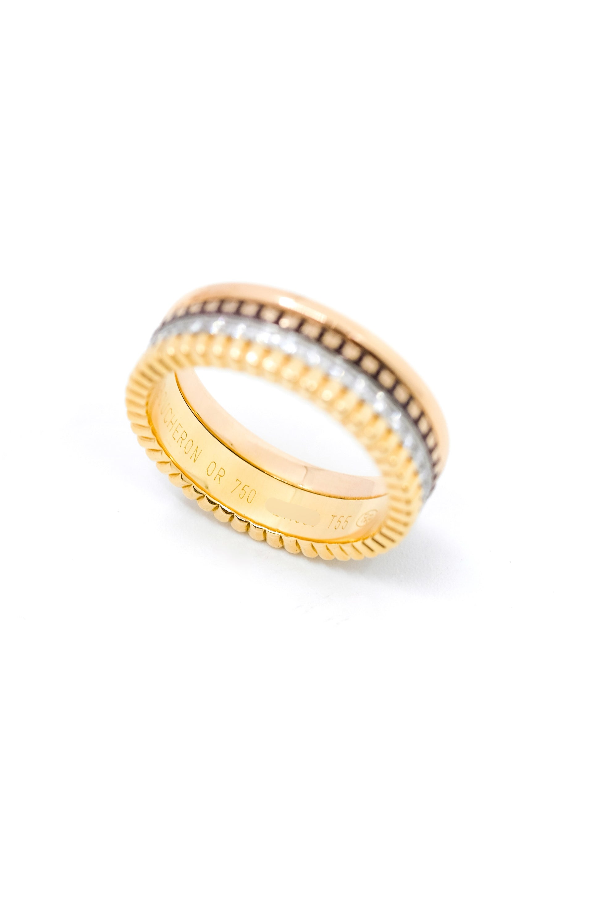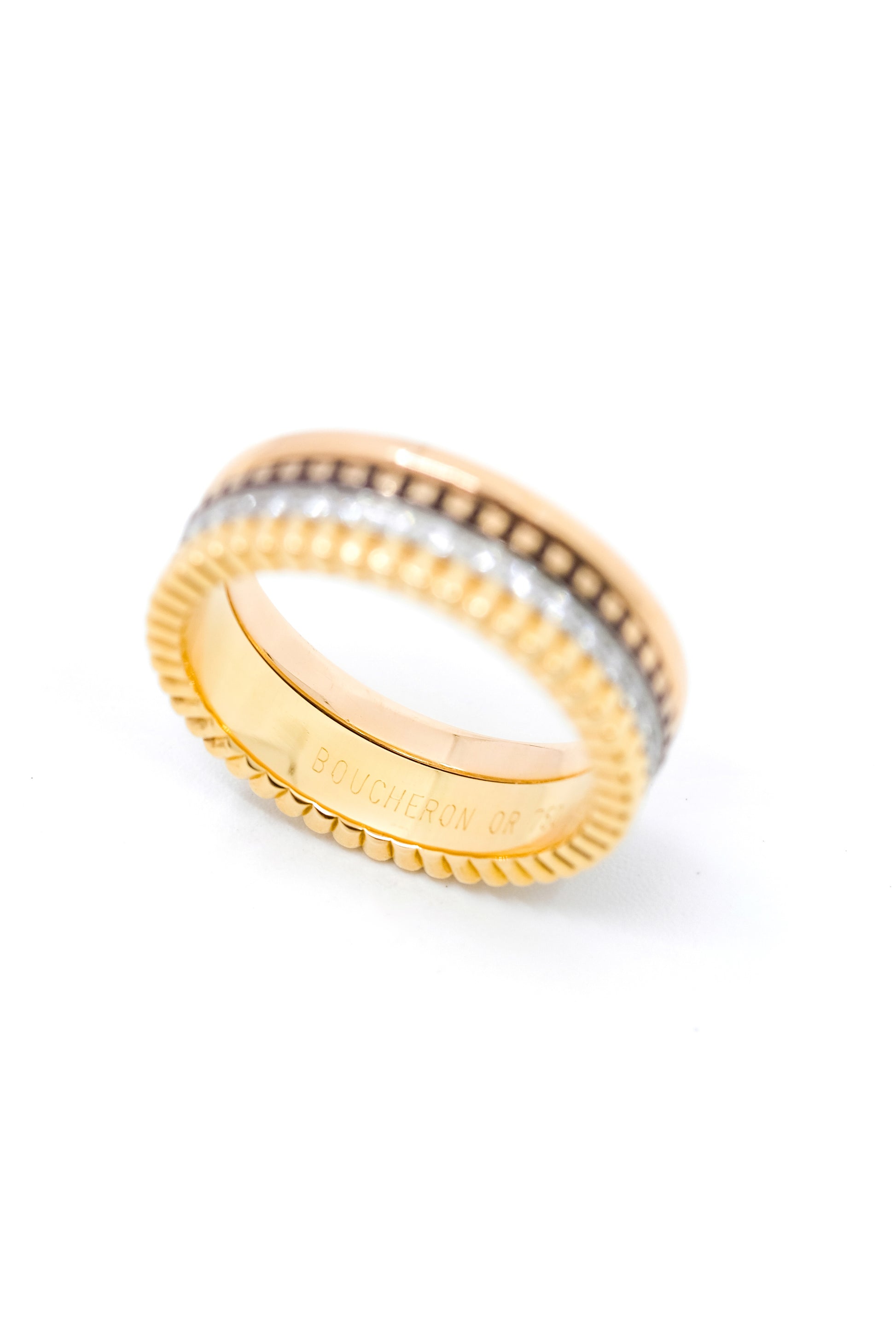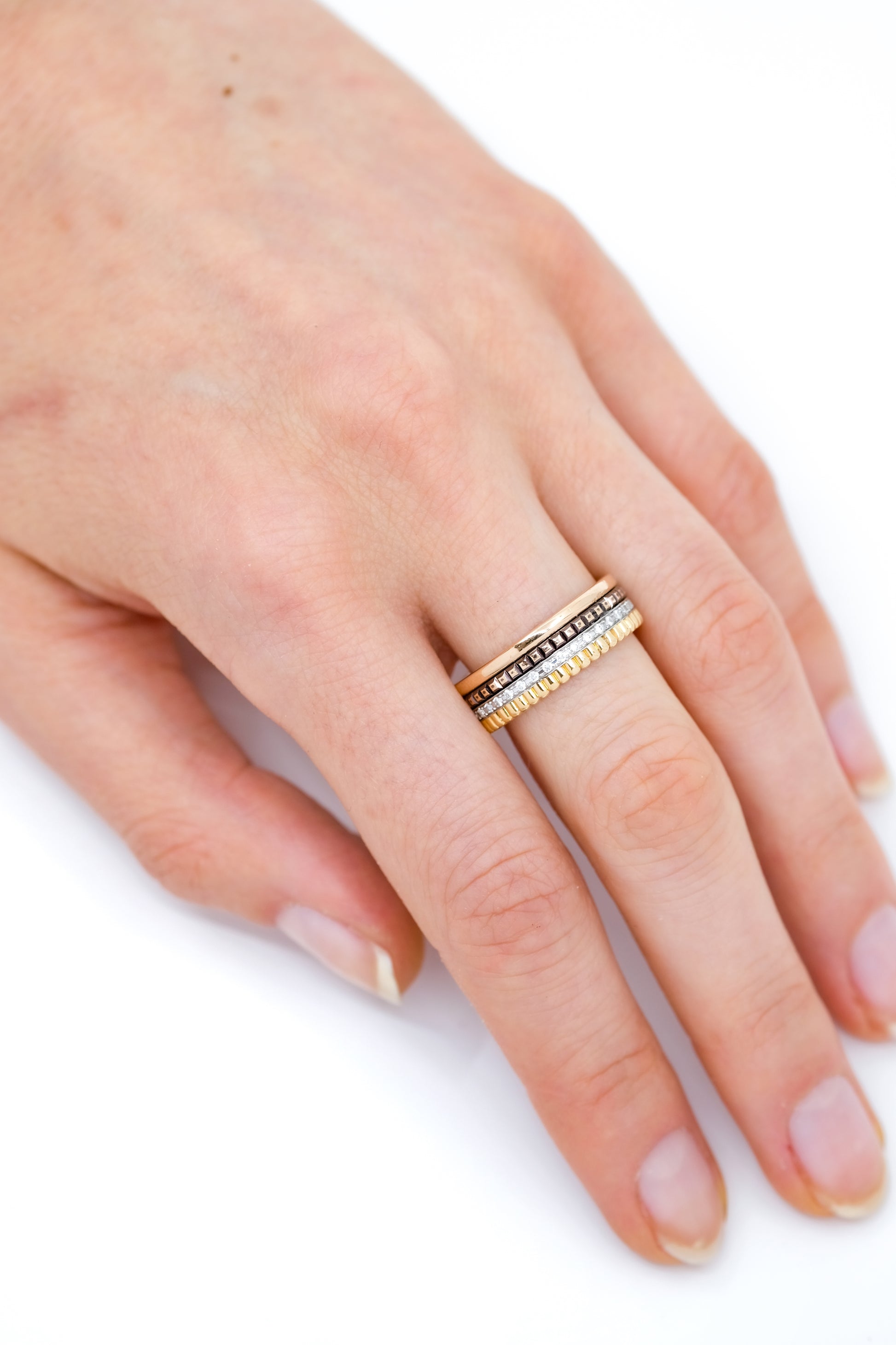 Beautiful Boucheron Quatre Classique medium model ring composed of a yellow gold fluted band, a simple smooth rose gold band, a white gold diamond-paved band, and a brown PVD "Clou de Paris" band. Four bands available in four patterns, four materials, and four textures.