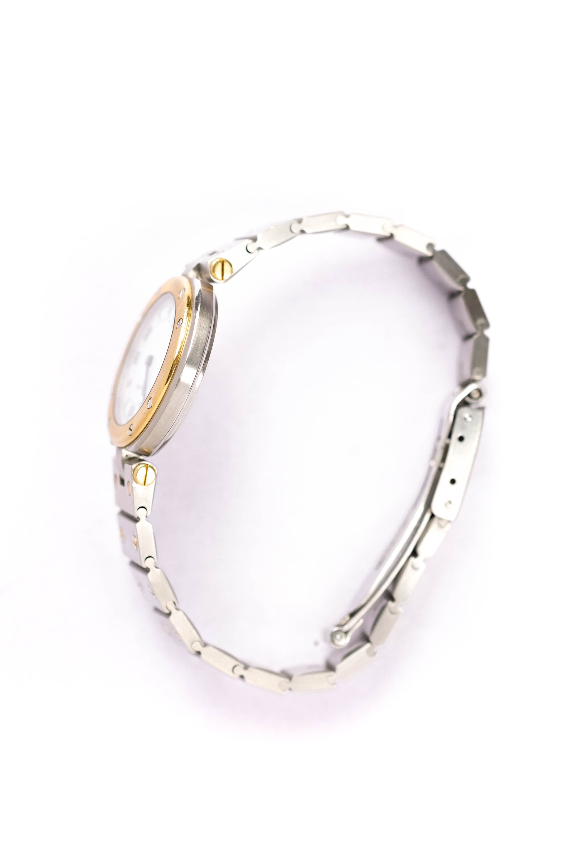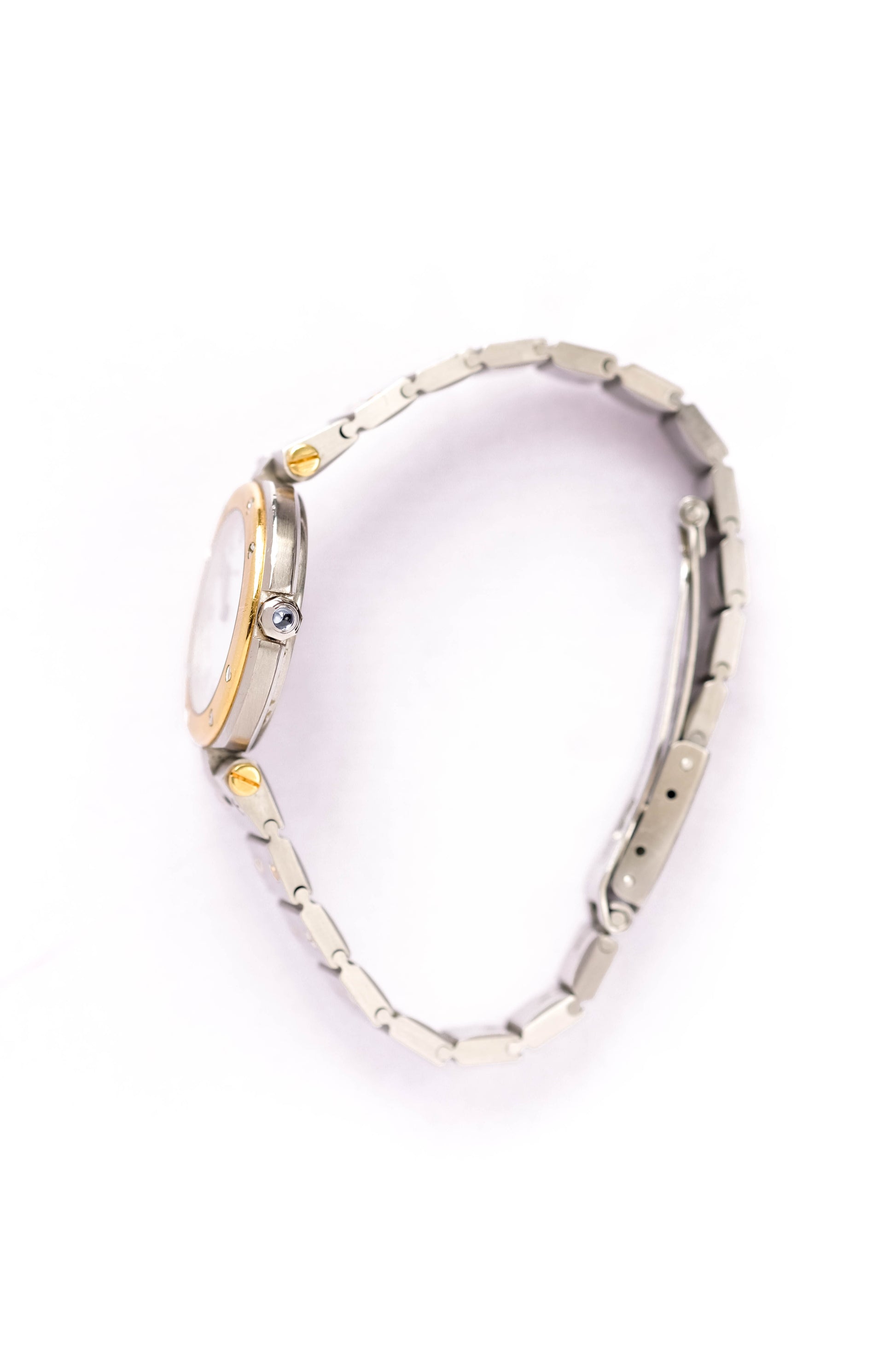 This gold and steel Cartier Santos can be worn every day. A watch that assumes a sporty look, always elegant since it is a Cartier. The steel bracelet and its thin case make it very pleasant to wear.