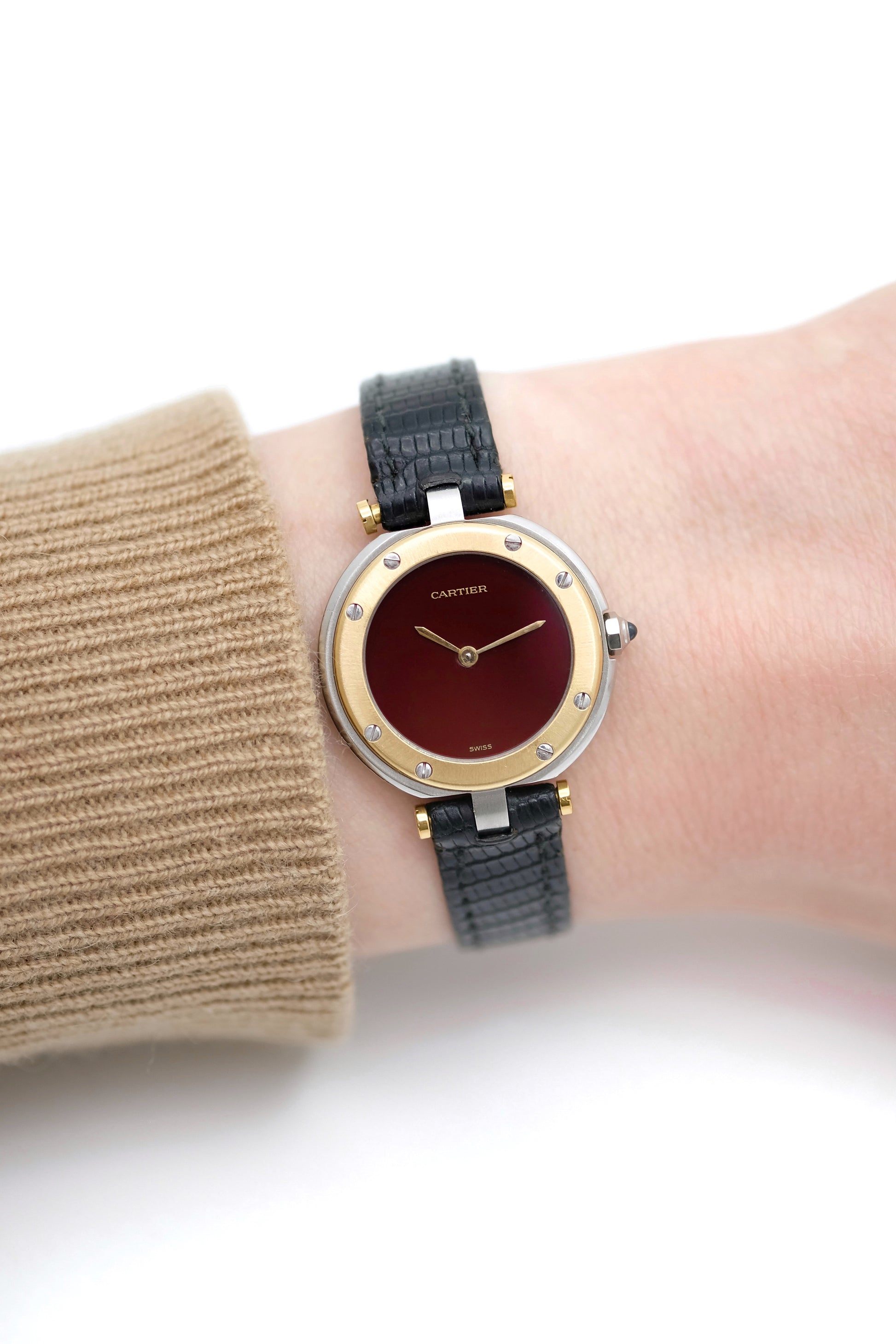 There is no doubt that Françoise has a particular affection for the Santos, an essential model within the Cartier repertoire. This version revisits its iconic codes, with a twist. Round Cartier watches, particularly those with a sporty character, are far less common. And this Santos Vendôme with its burgundy dial is rarer still.