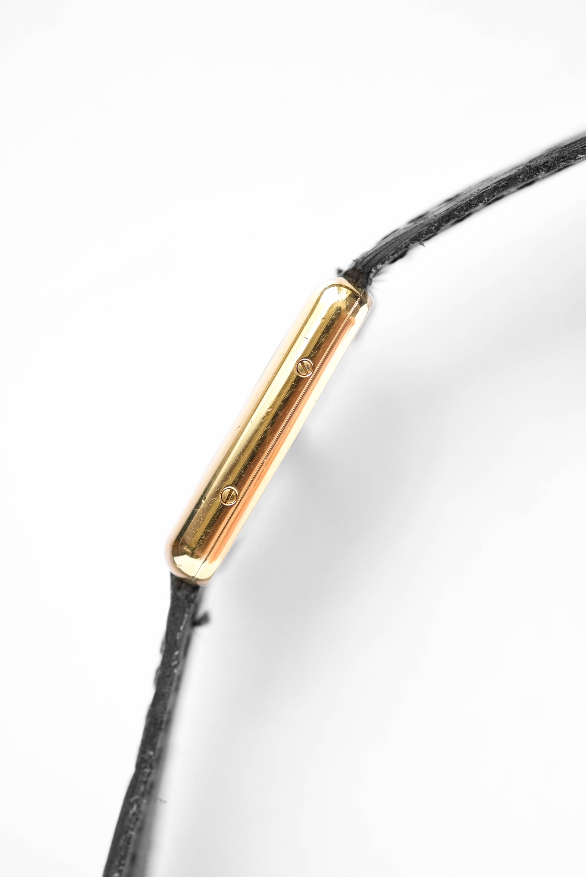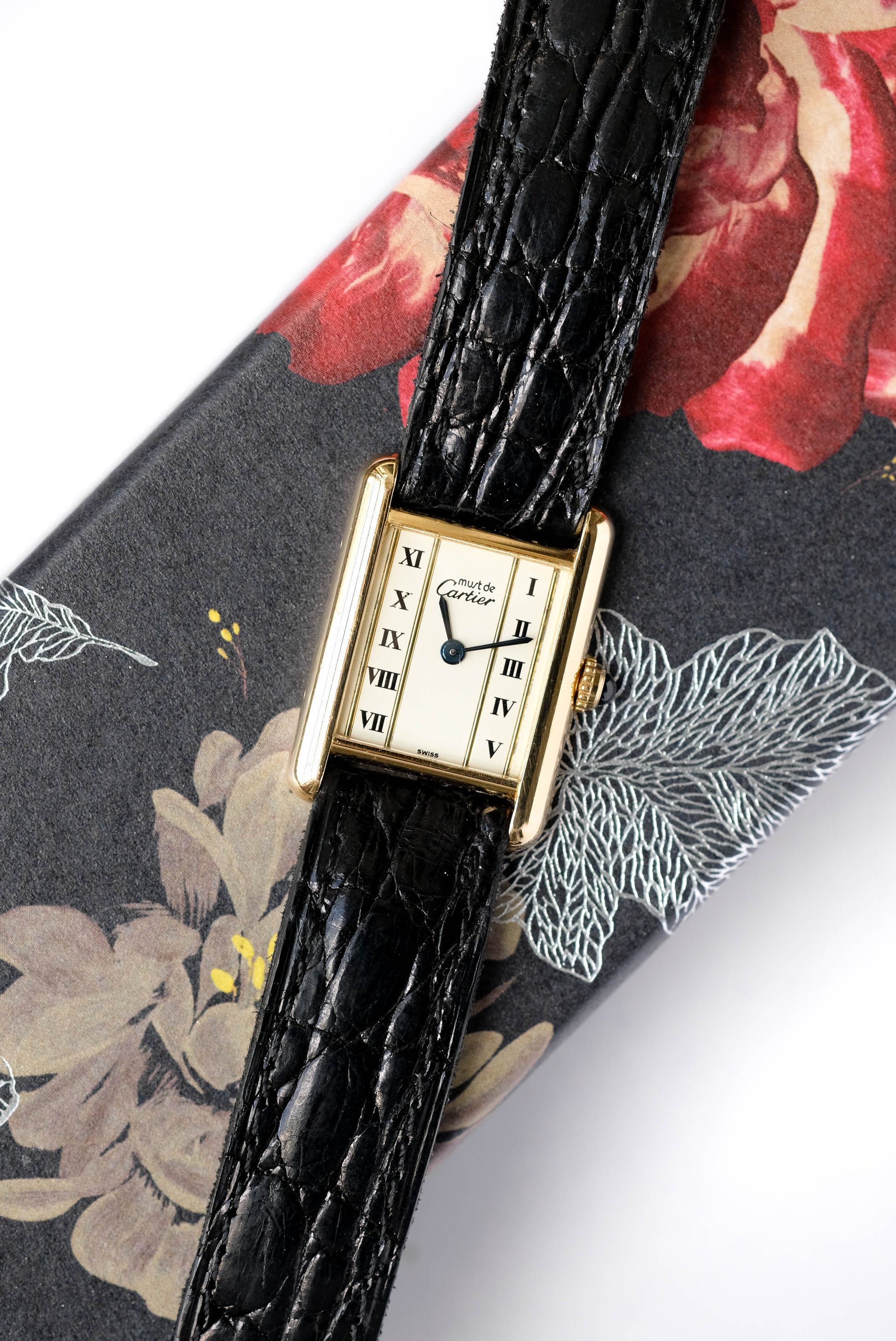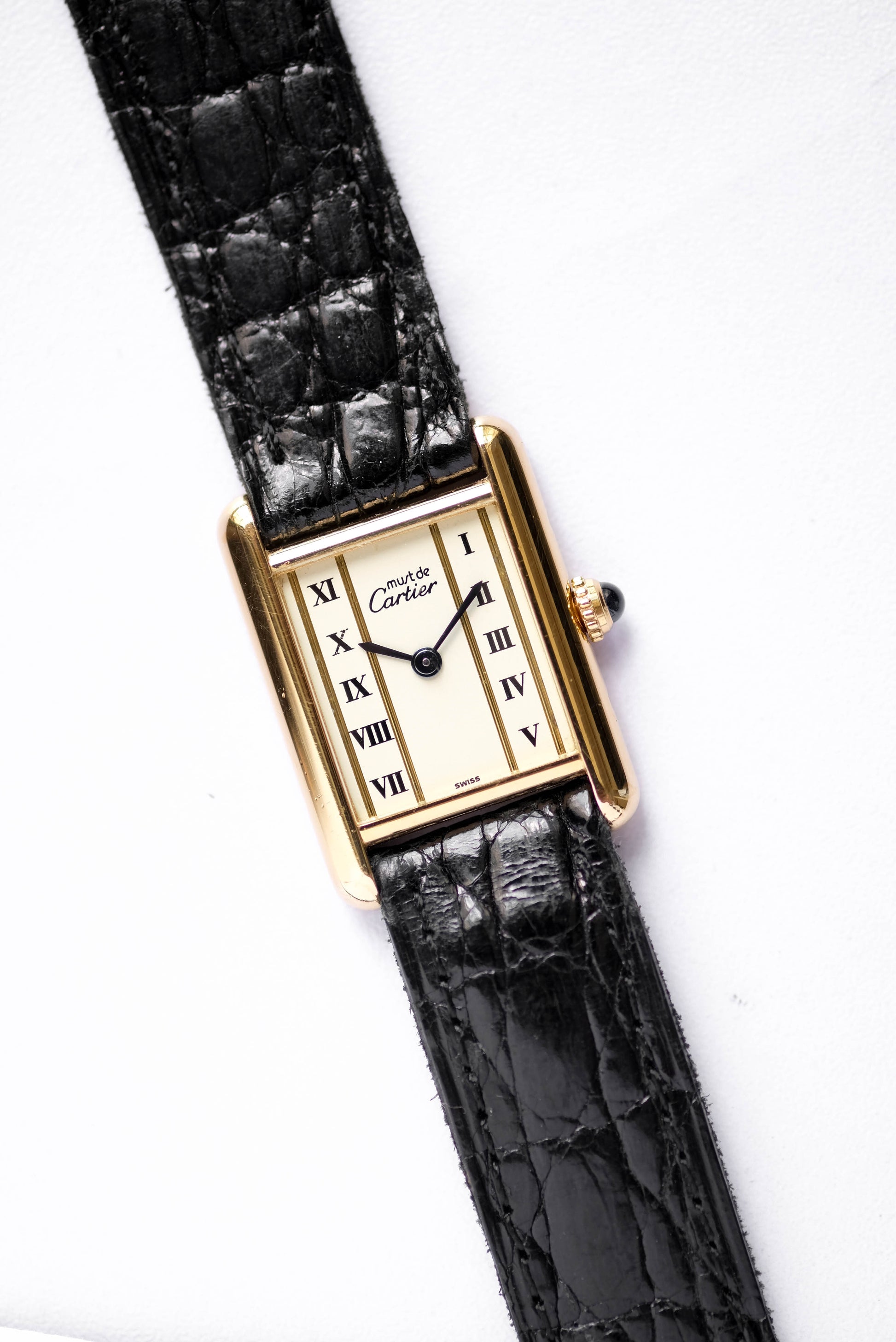 Taking up the stylistic characteristics of its solid gold predecessor, the Tank Must frees itself from the classic Tank in 2 radical ways. First of all, the use of plated gold (or silver), and not solid gold, which permits a drastically lower bill! And of course, the dial! Moving away from the traditional Roman numerals on a matte white dial, the Must line offers incredible dials, some lacquered, with Arabic numerals, or others, like this one, with a very original horizontal index distribution!