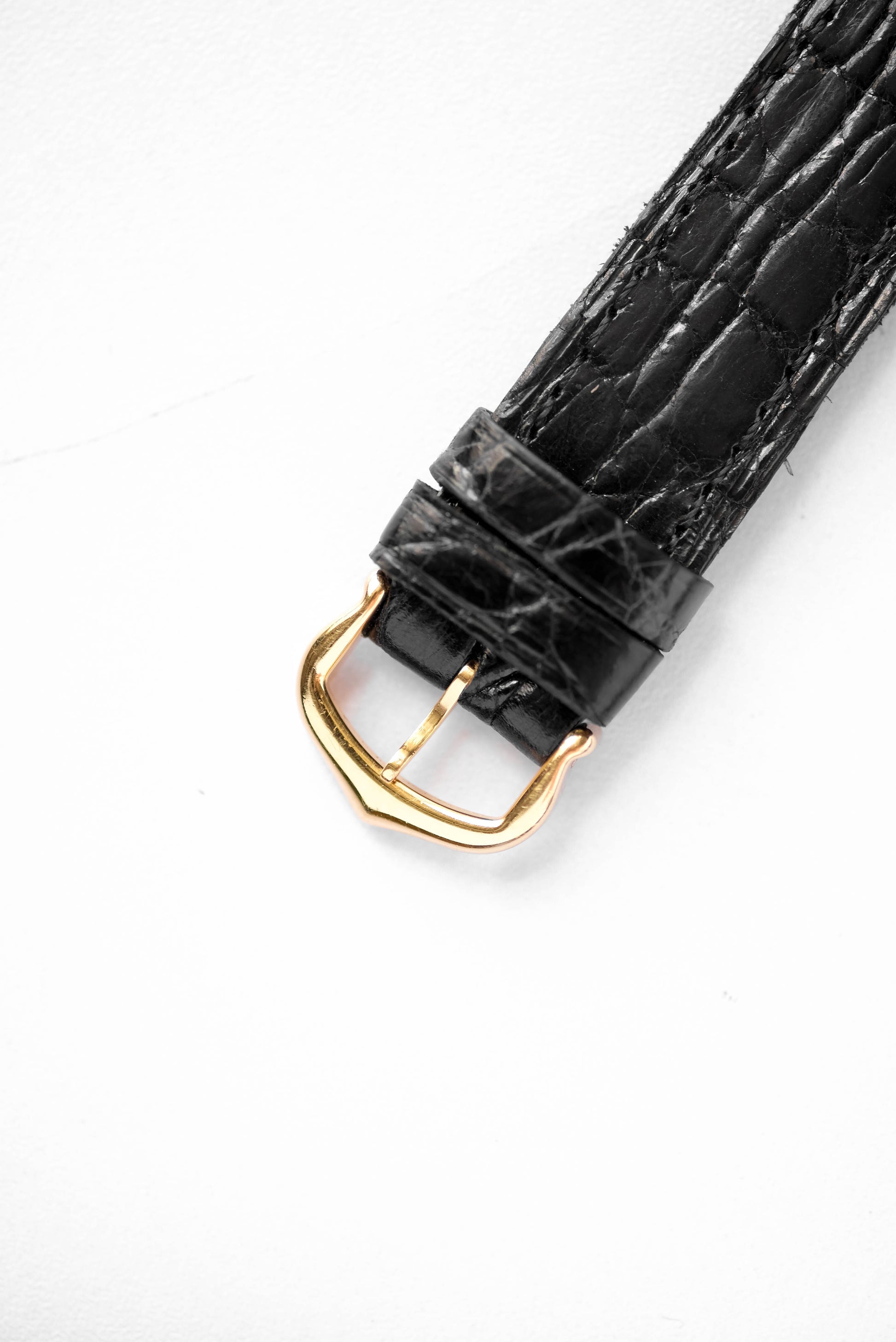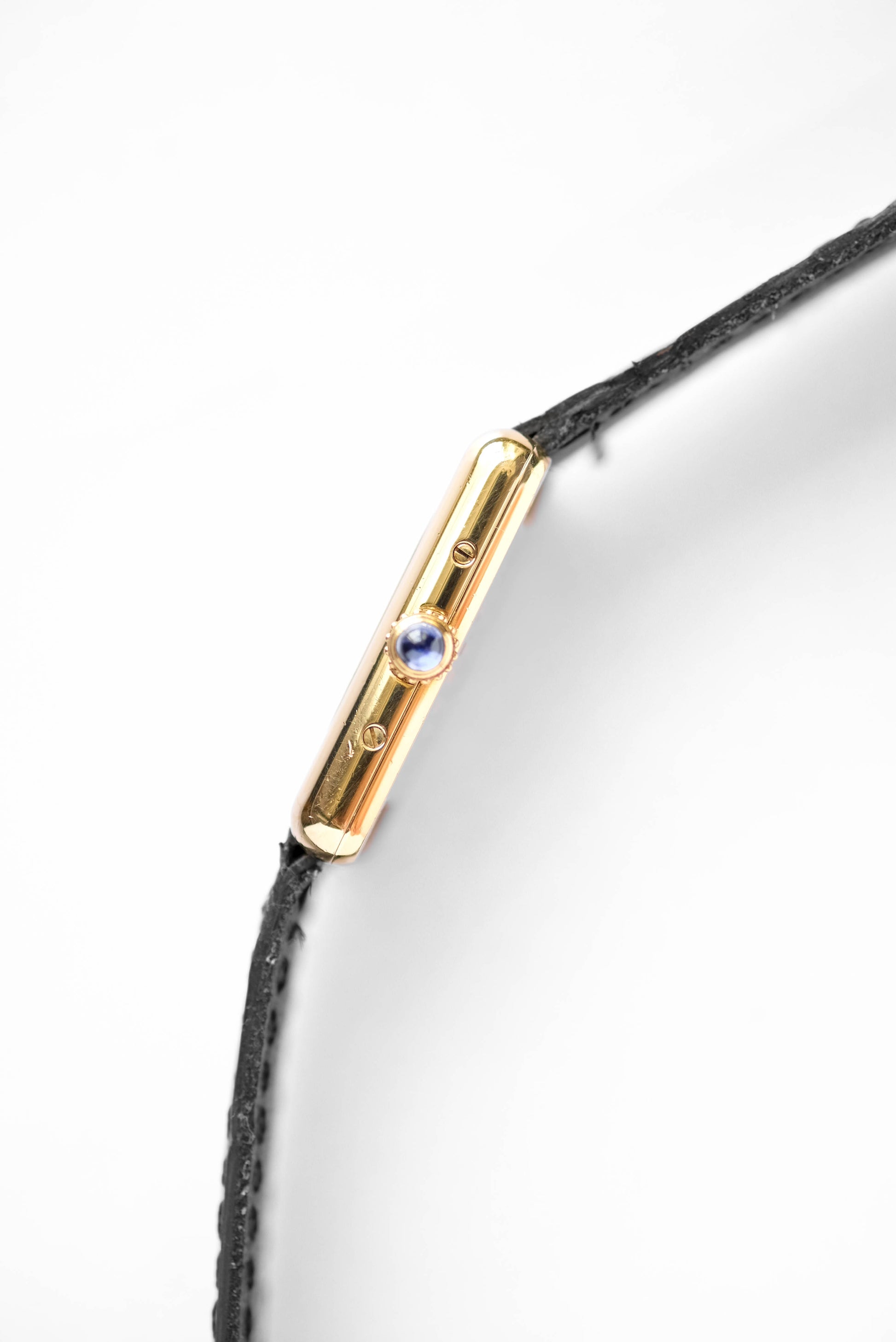 Large, medium, small, solid gold, gold plated, classic dial, colored lacquered dial, on simple or colored leather... It doesn't matter, Françoise loves the Tank, all the Tanks! If Françoise particularly appreciates colored lacquered dials, she immediately fell under the spell of this one, which brings together the best of both worlds: the contained budget of a Must, with the originality of its dial with horizontal Roman indexes. The almost severe index placement recalls the straight lines (or brancards in French) of the Tank.