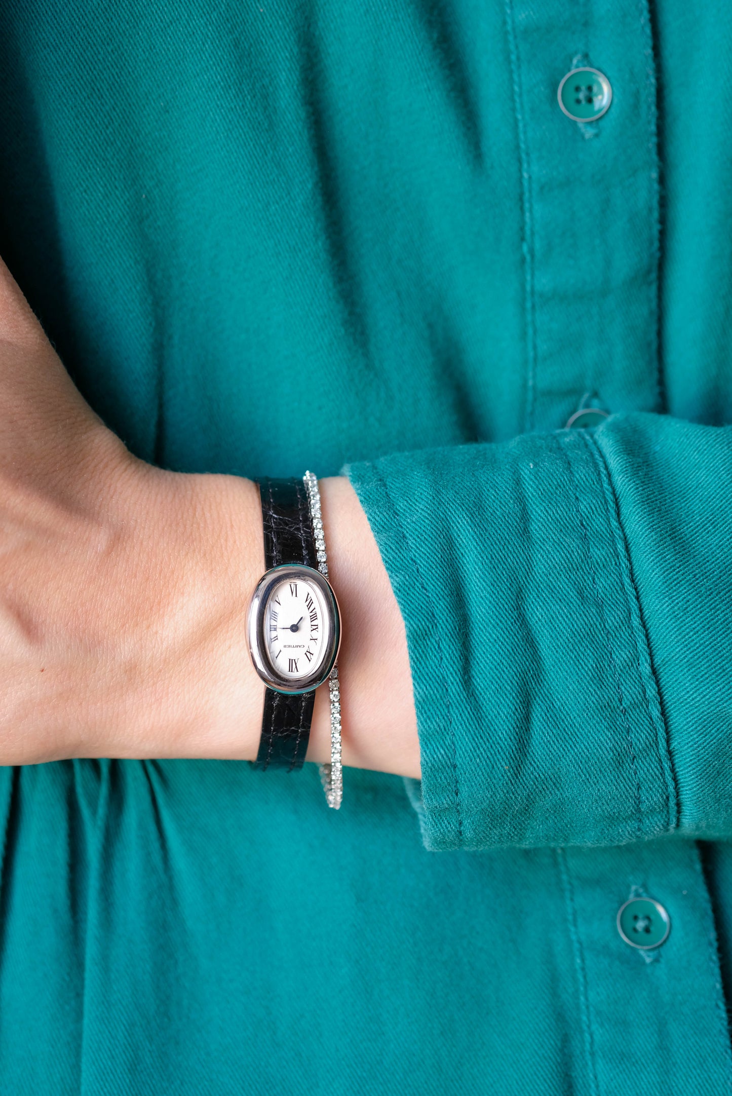 Comment évoquer Cartier sans penser au modèle Baignoire ? Tout en élégance, volupté et délicatesse, la Cartier Baignoire convoque à elle seule la femme et l'identité Cartier. Elle illustre également les capacités techniques de la Maison à créer un mécanisme s'intégrant dans un boîtier ovale. Sur ce modèle, le boitier ovale est plus petit que la Baignoire classique, rendant la prouesse technique encore plus étonnante ! L'autre particularité technique est l'absence de couronne, ce qui permet un ovale ininterrompu, comme un nuage sur le poignet. Le réglage de l'heure se fait au dos de la montre, à l'aide d'un poinçon et d'un bouton poussoir. L'or blanc parfait l'élégance de la petite taille, et transforme cette montre en un bijou précieux et discret.