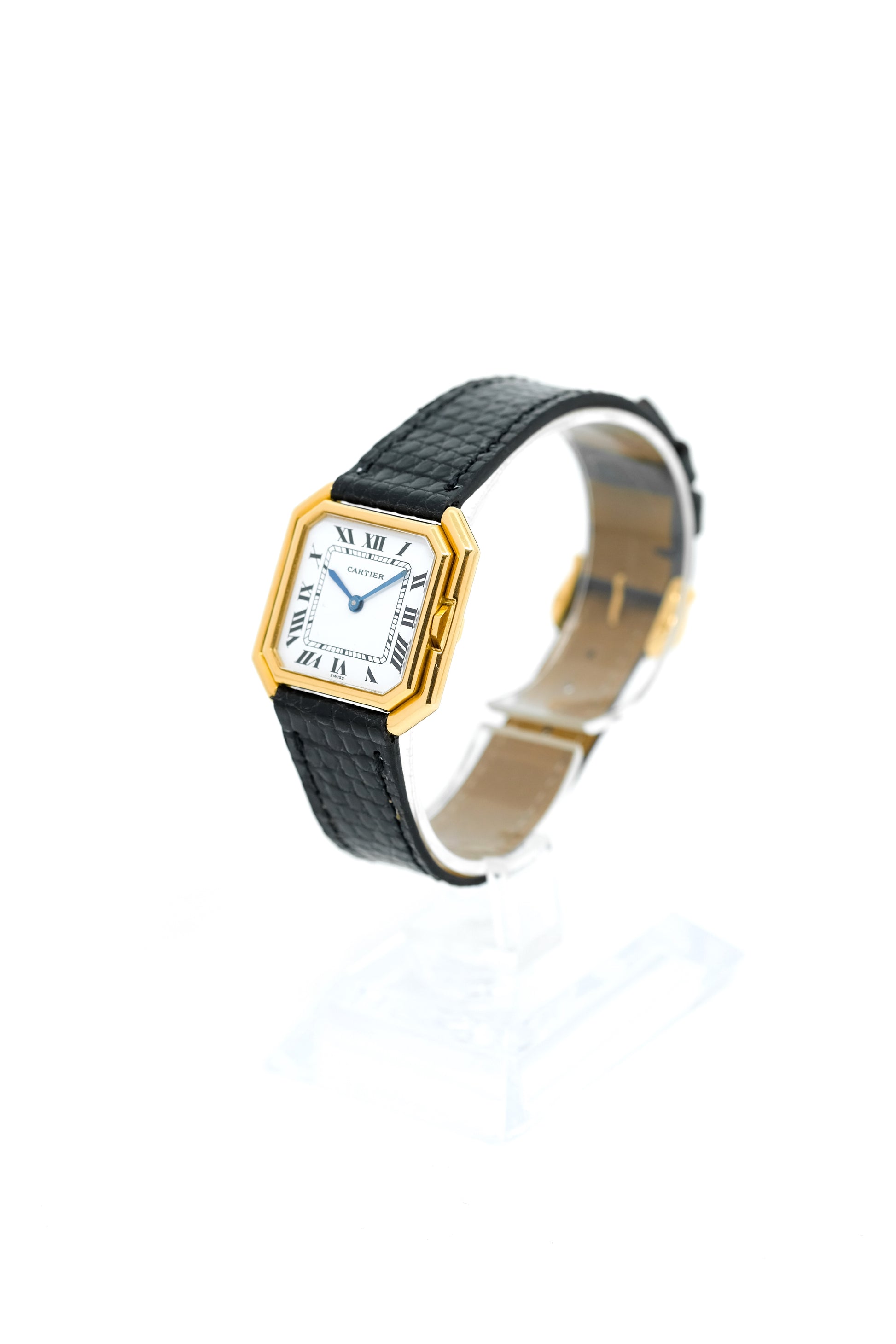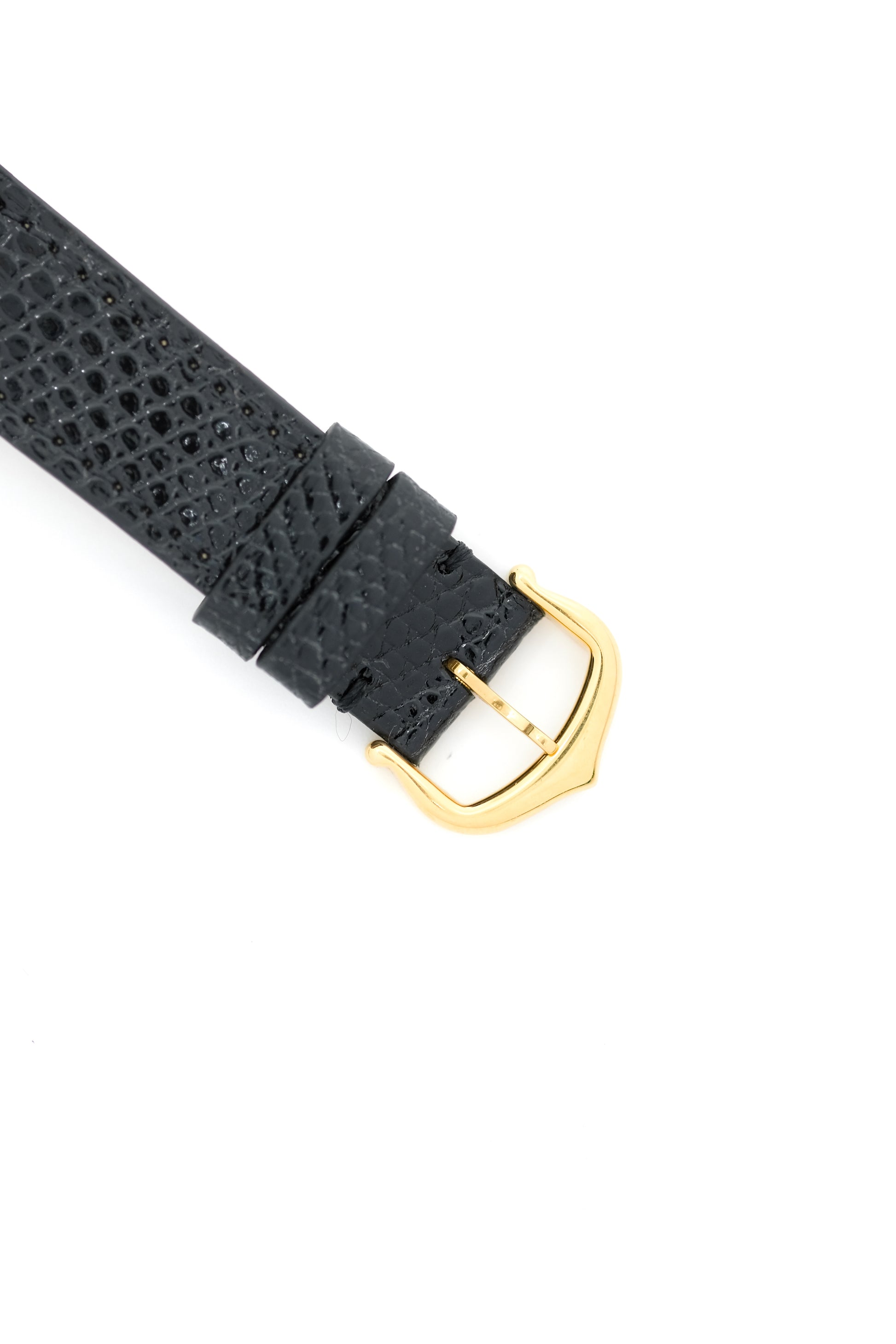 Boîtier et boucle ardillon Cartier en or jaune 18 carats. Bracelet en cuir lézard. Accompagnée de ses papiers revendeurs.