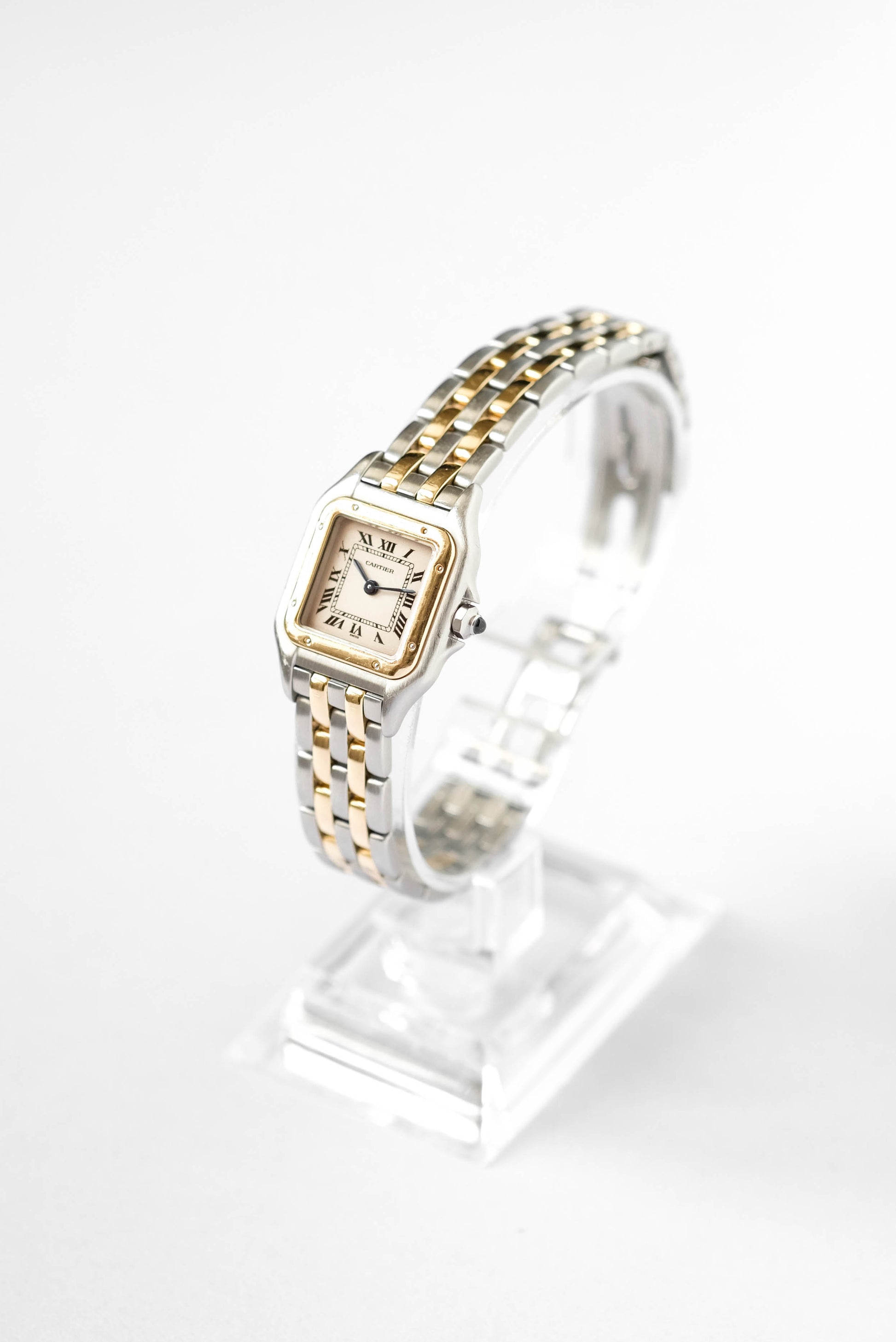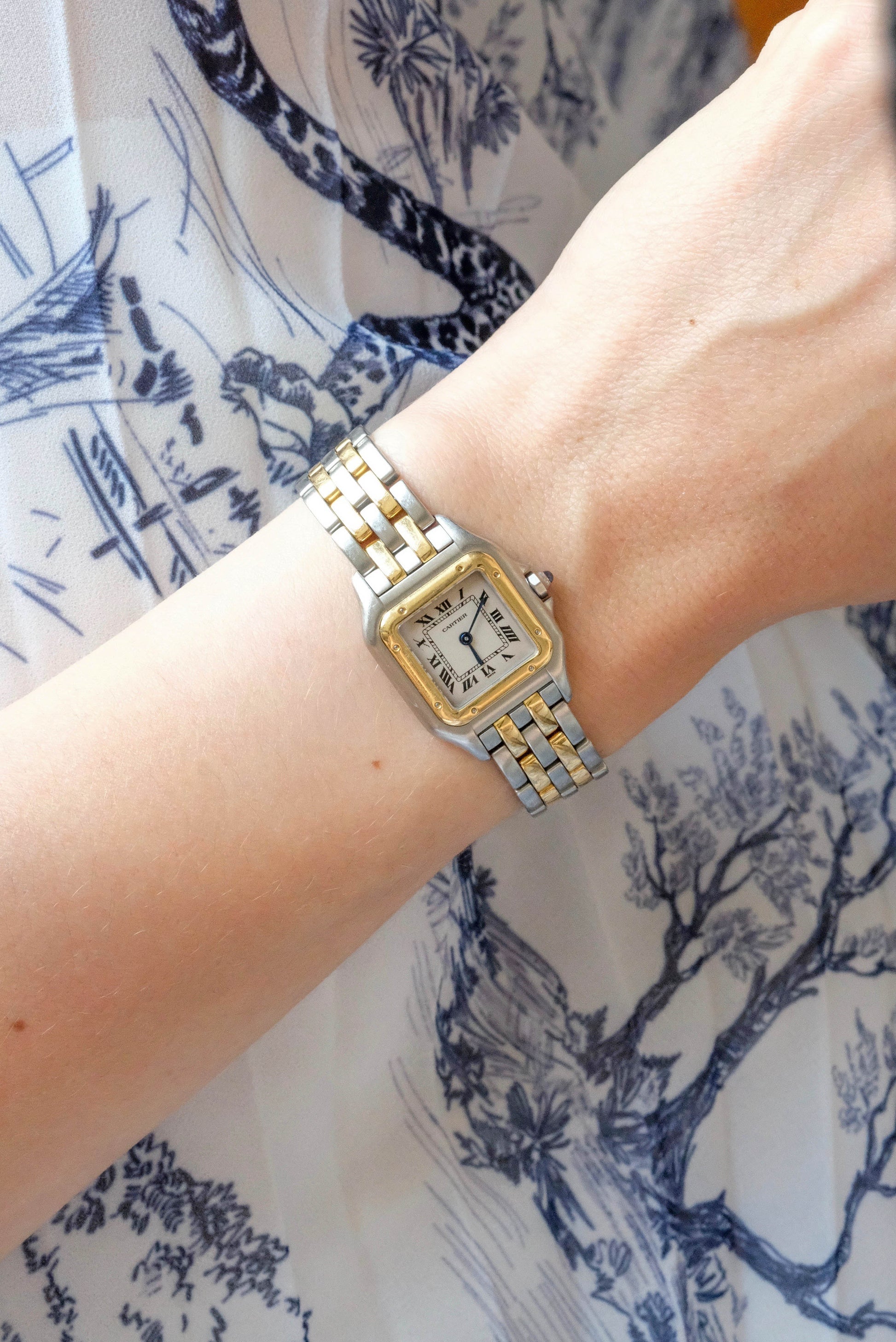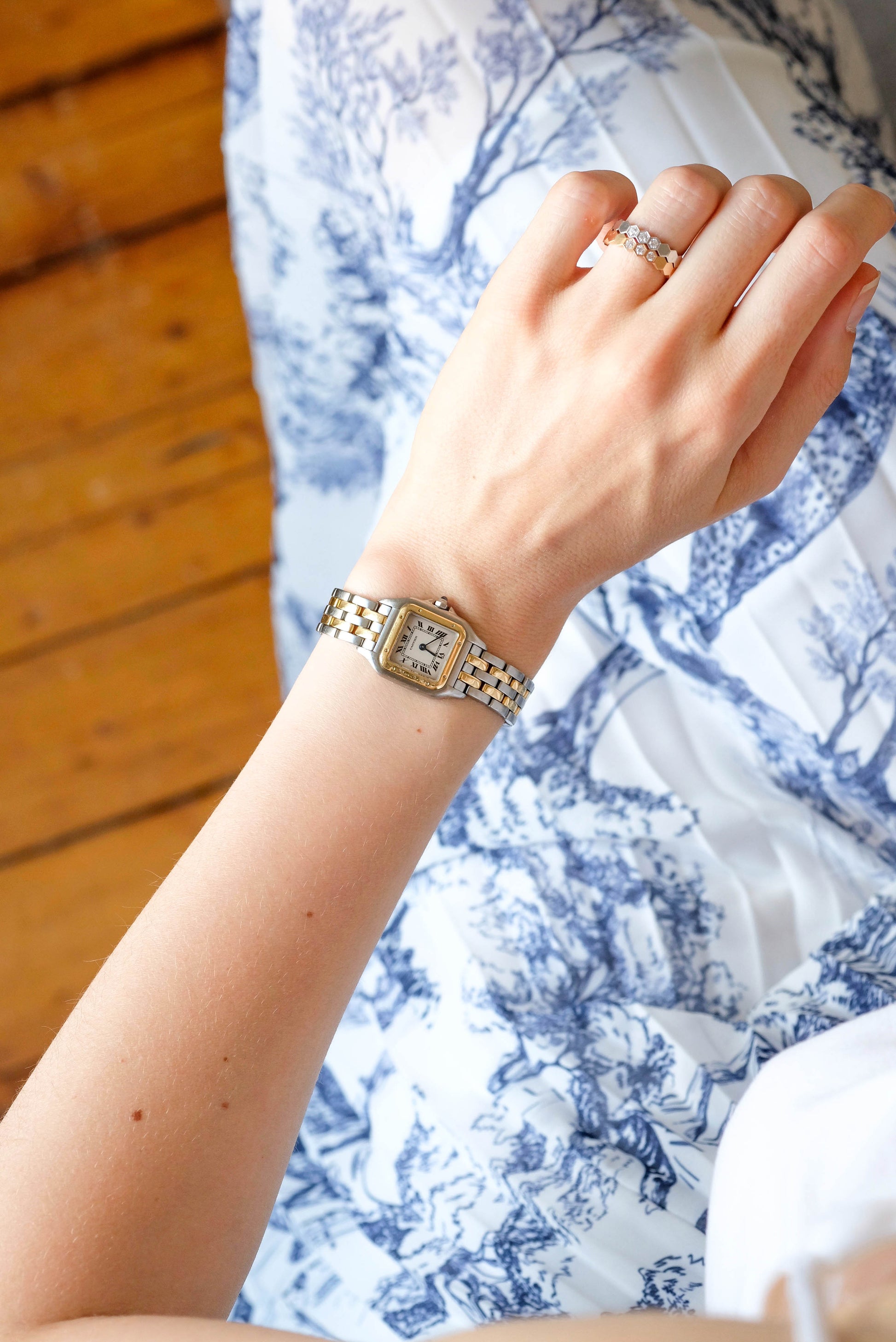 Il s'agit peut-être ici de la version la plus classique : une taille medium en or jaune et acier sur son bracelet au deux rangs d'or Le cadran est aussi le plus pur, comme les premières Panthères à être vendues, sans fenêtre de date. Cette plus petite version est définitivement féminine (par rapport à la taille classique qu'on voit autant sur des poignets féminins que masculins), mais encore plus agréable à porter que sa grande soeur (est-ce possible ?)
