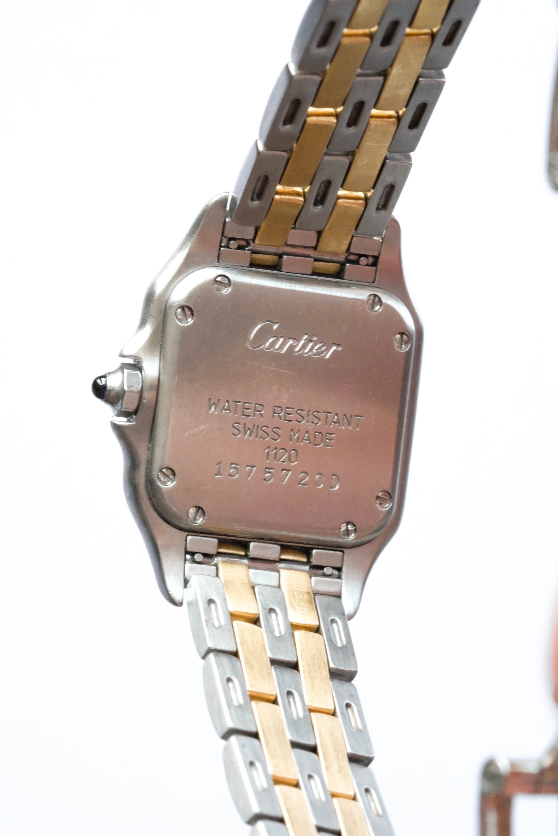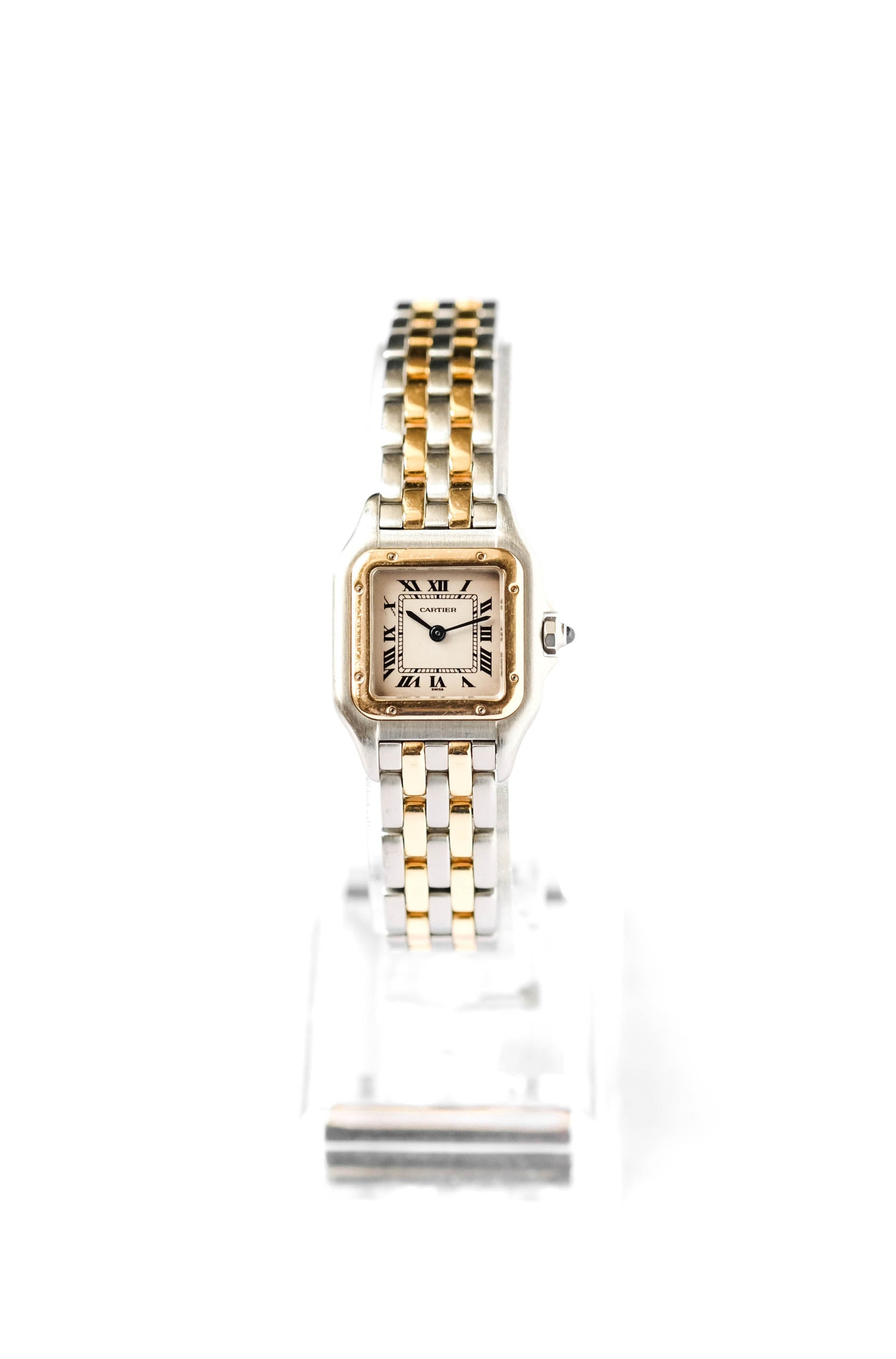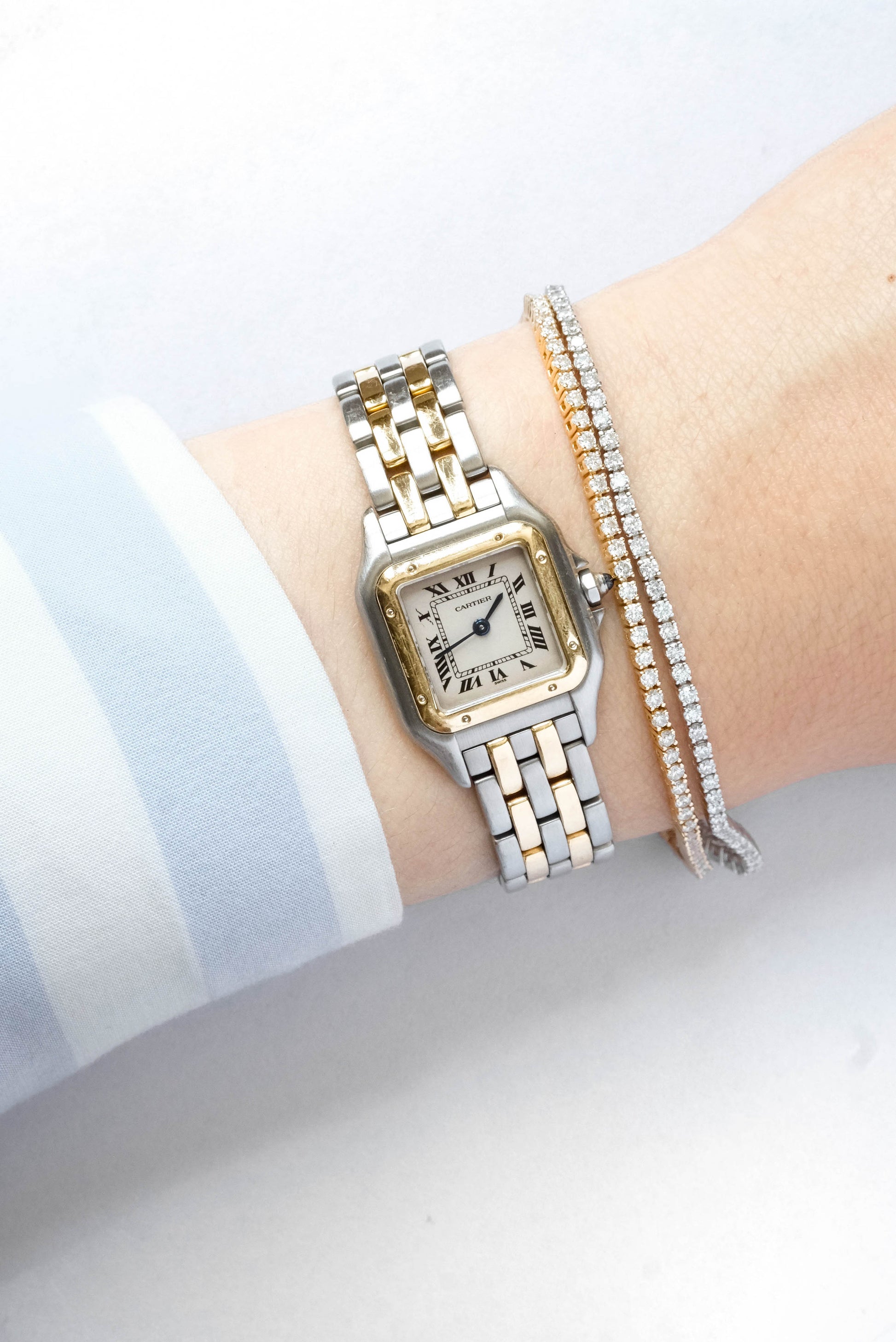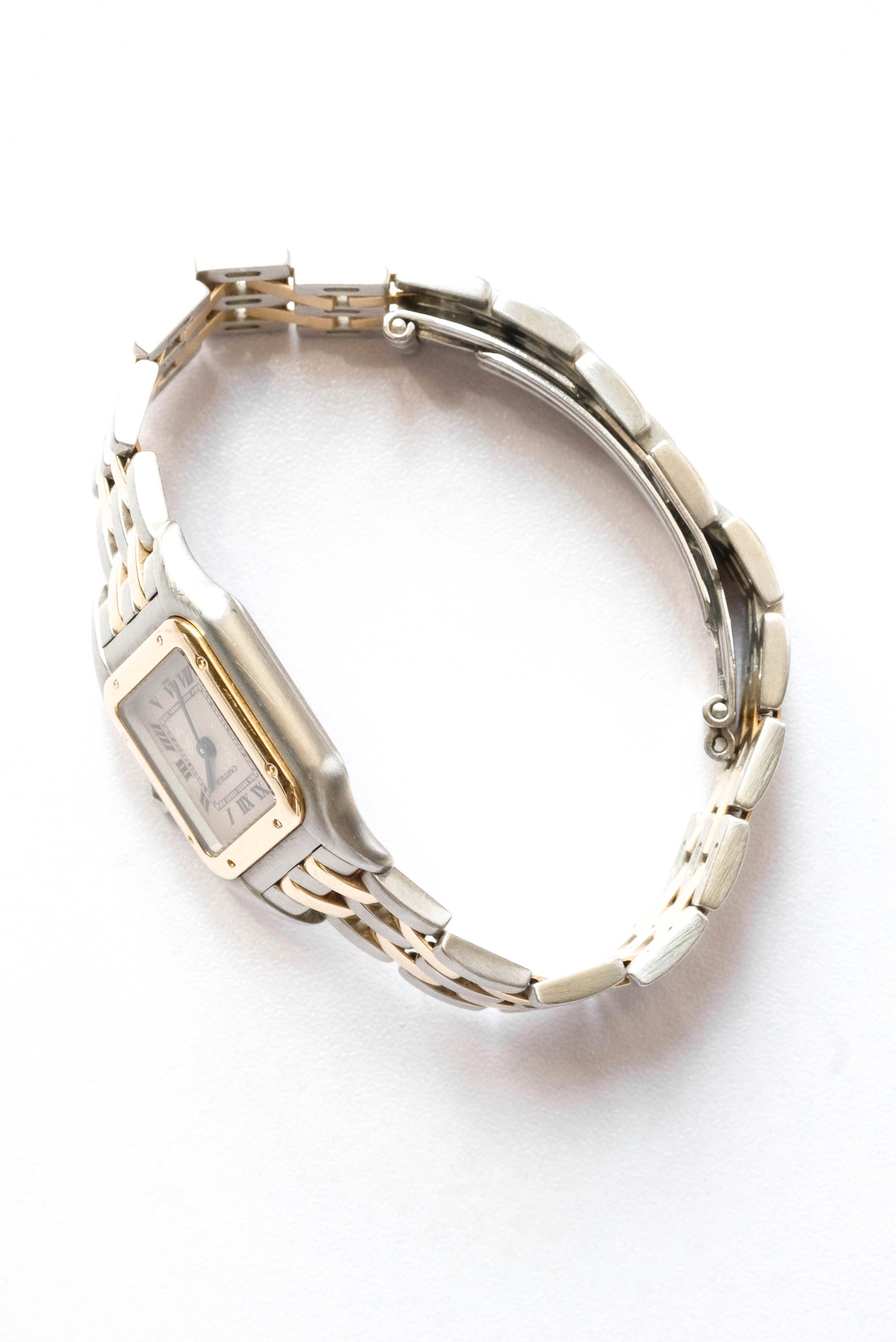 Il s'agit peut-être ici de la version la plus classique : une taille medium en or jaune et acier sur son bracelet au deux rangs d'or Le cadran est aussi le plus pur, comme les premières Panthères à être vendues, sans fenêtre de date. Cette plus petite version est définitivement féminine (par rapport à la taille classique qu'on voit autant sur des poignets féminins que masculins), mais encore plus agréable à porter que sa grande soeur (est-ce possible ?)