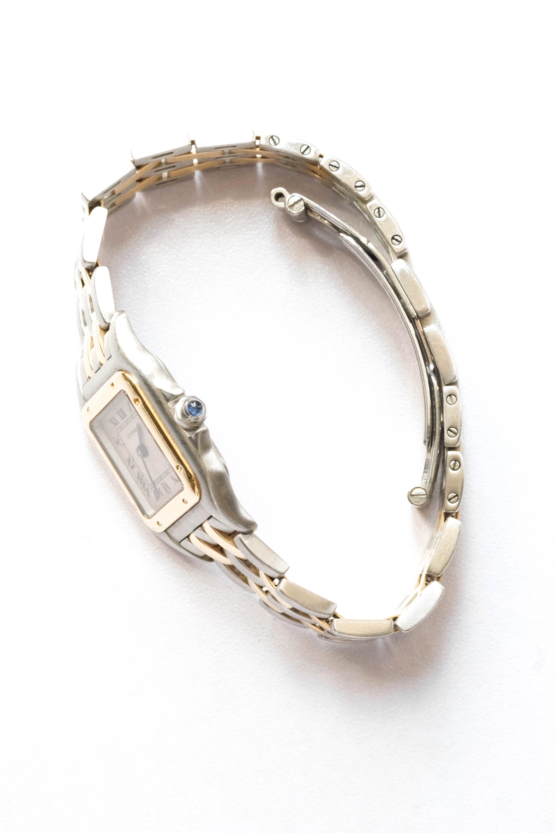 La montre Panthère fut lancée dans l’esprit festif des années 1980, alors que Michèle Kaouni était directrice de la création au sein de la Maison Cartier. Elle tire son nom du bracelet : à la fois souple et épuré, il évoque la manière dont le félin se déplace, tout en rondeur, élégance et sensualité. Chez Cartier, l’évocation de la panthère par son pelage fait partie de son identité. Le motif tacheté apparaît pour la première fois sur une autre montre-bracelet pour dame en 1914, en onyx et diamants.