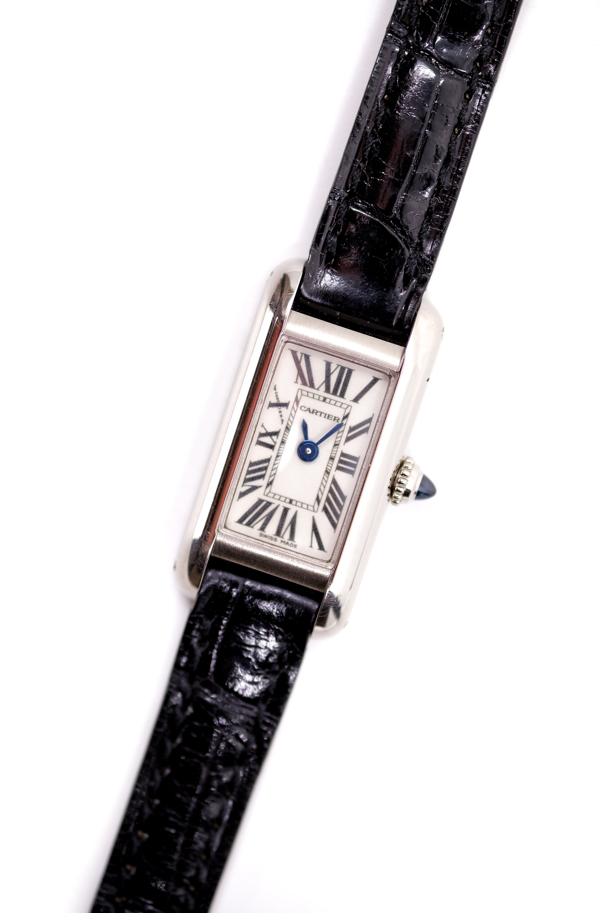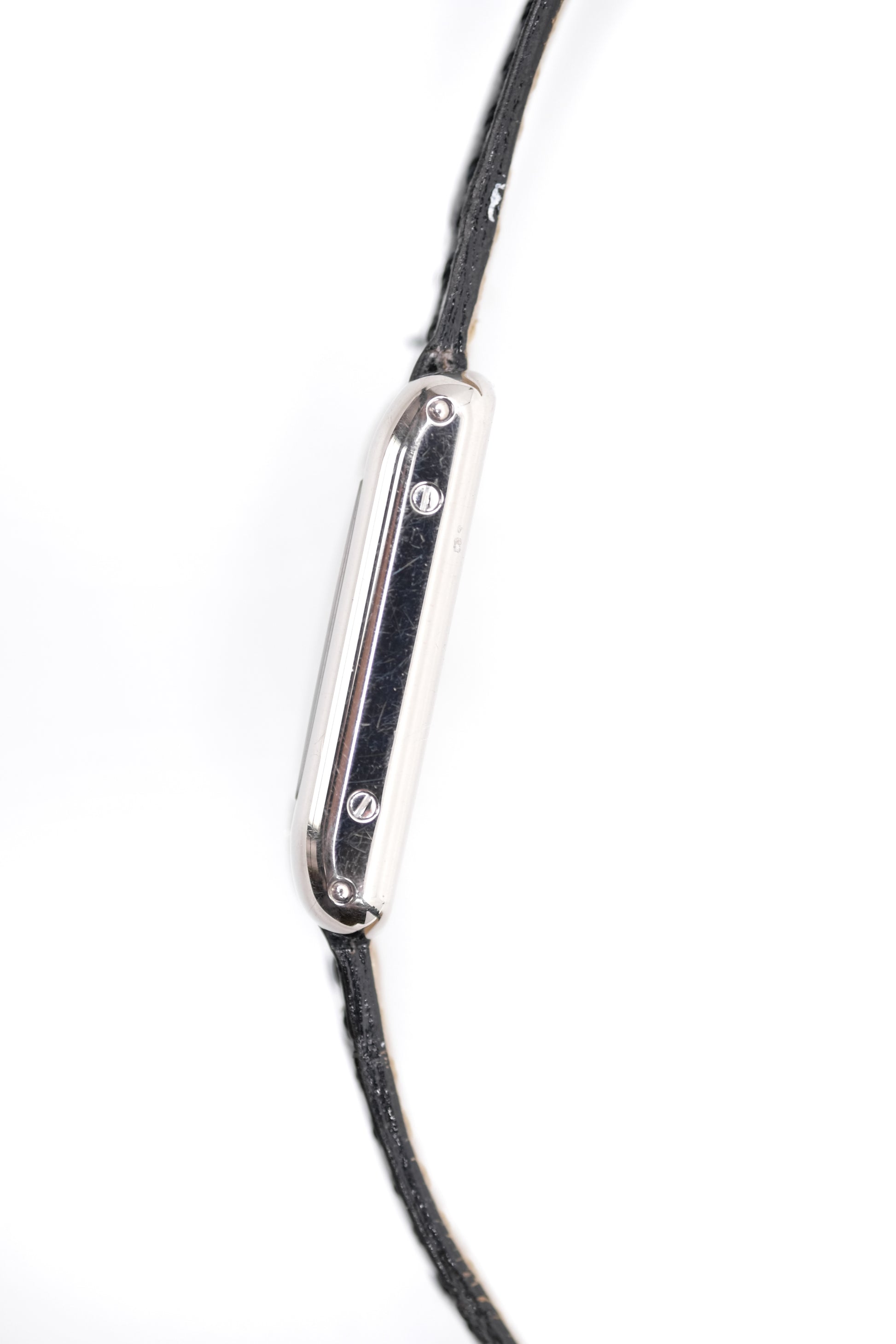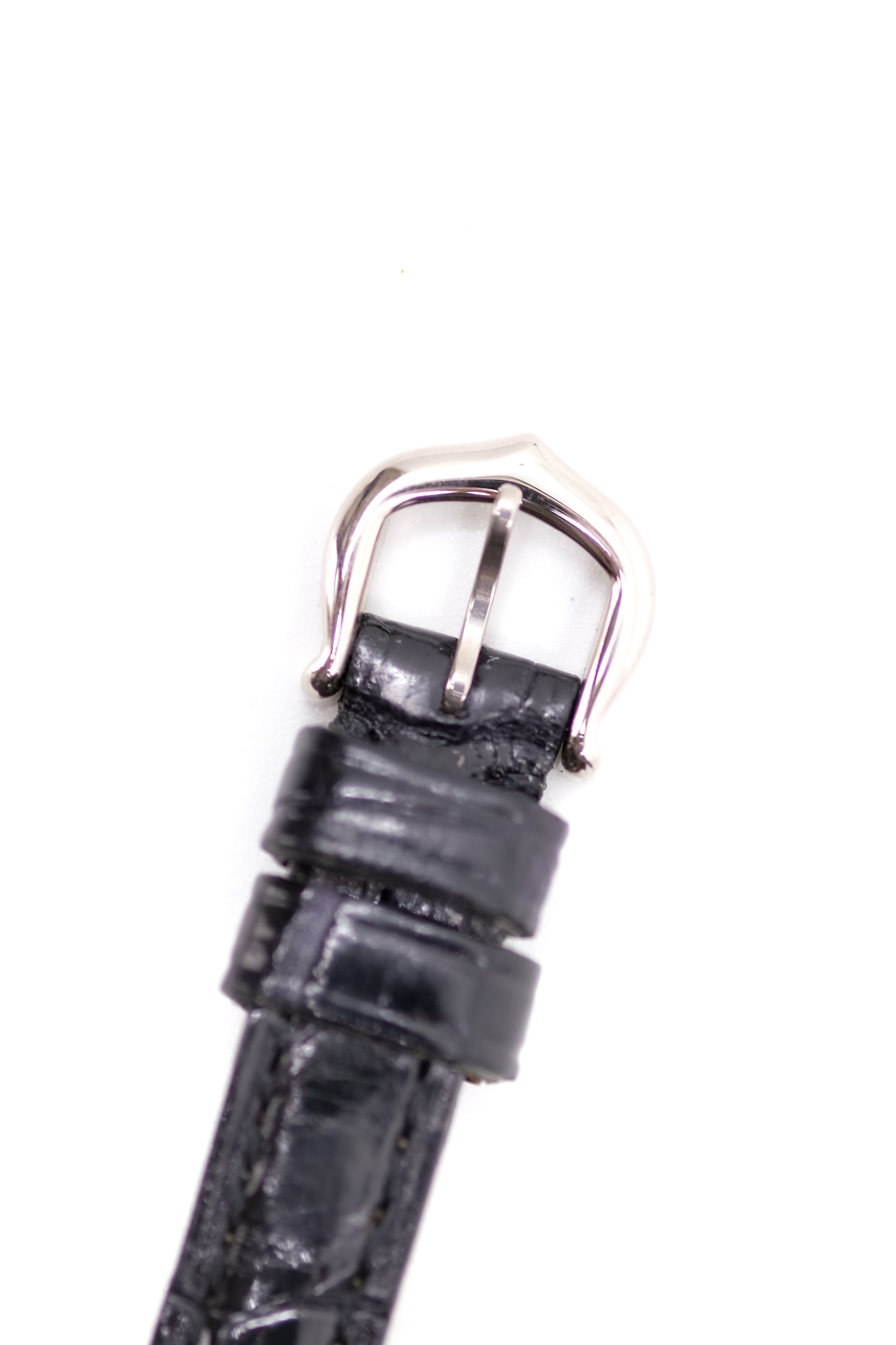 Boîtier et boucle ardillon Cartier en or blanc 18 carats. Bracelet Cartier en cuir noir d'alligator.