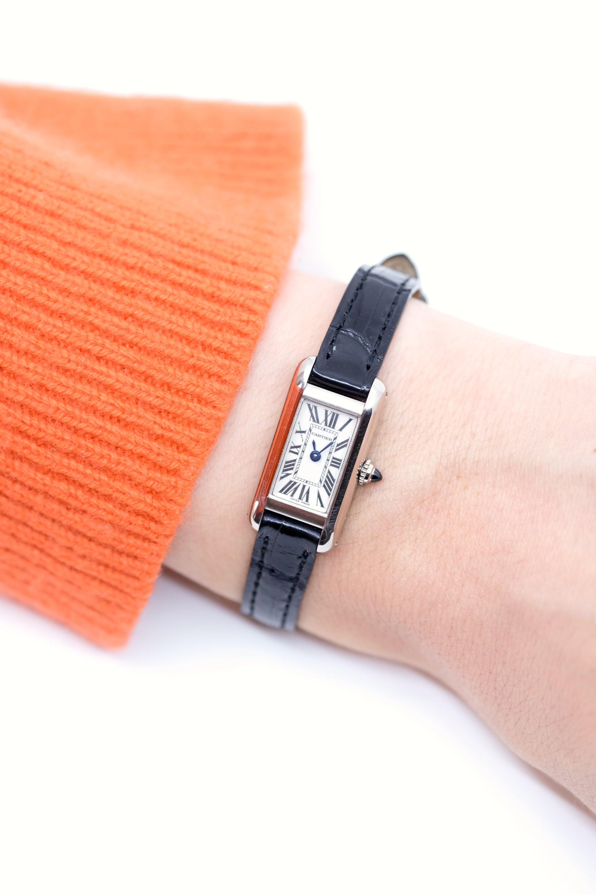 Françoise aime tous les types de Tank, qu'elles soient classiques, serties, en or jaune, en or blanc, ou encore en version mini comme celle-ci. C'est une montre que l’on ne peut que recommander, notamment en or blanc, matériau moins courant au poignet. On l'oublierait presque au poignet si elle n'était pas si incontournable, autant d’un point de vue historique que stylistique. Une montre qui ne perdra jamais de sa valeur. C’est, par excellence, la montre que l’on prend plaisir à transmettre. Une pièce qui allie technique et esthétisme : la fonctionnalité, l’élégance et la prouesse sont de mise. La Tank « a été créée avec brio pour demeurer éternellement contemporaine ». C’est pour cela que nous lui faisons entièrement confiance.