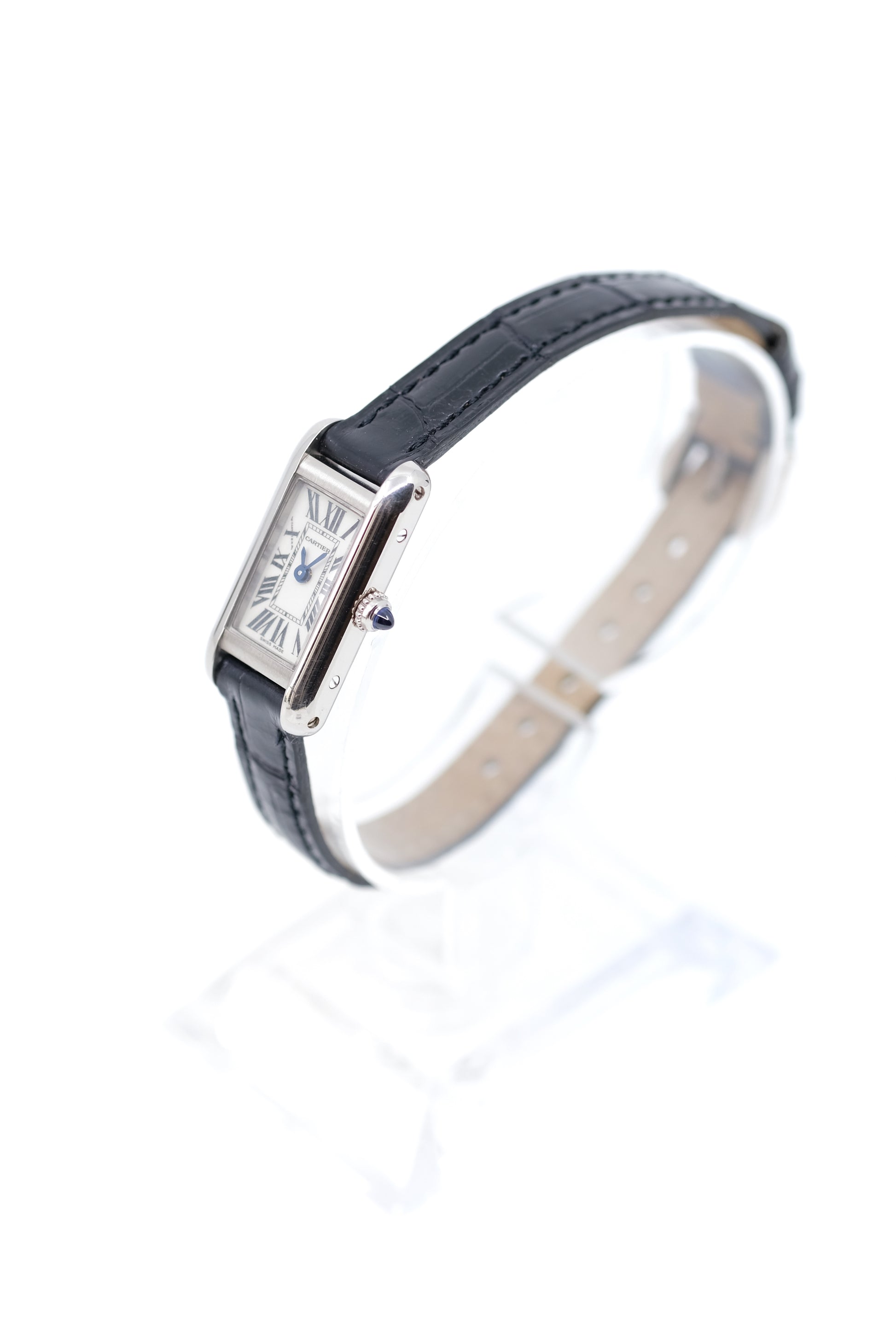 Un boîtier en or, brancards latéraux débordants, échelle de minutes en forme de chemin de fer, aiguilles bleues et couronne de remontoir ornée d’un cabochon de saphir en pointe : tous les codes de la Tank Louis Cartier sont posés. Immédiatement reconnaissable à son dessin iconique, cette montre n’a rien perdu de son charme, notamment avec ses dimensions qui en font un véritable bijou. Elle est élégante, pratique, très confortable au poignet. Elle plaira à celles et ceux qui aiment les petites montres discrètes et habillées, notamment avec son boîtier en or blanc 18 carats associé à un bracelet Cartier en cuir noir d'alligator. Grâce à son cadran blanc, elle peut être associée à la couleur de bracelet de son choix, selon les goûts et les saisons.