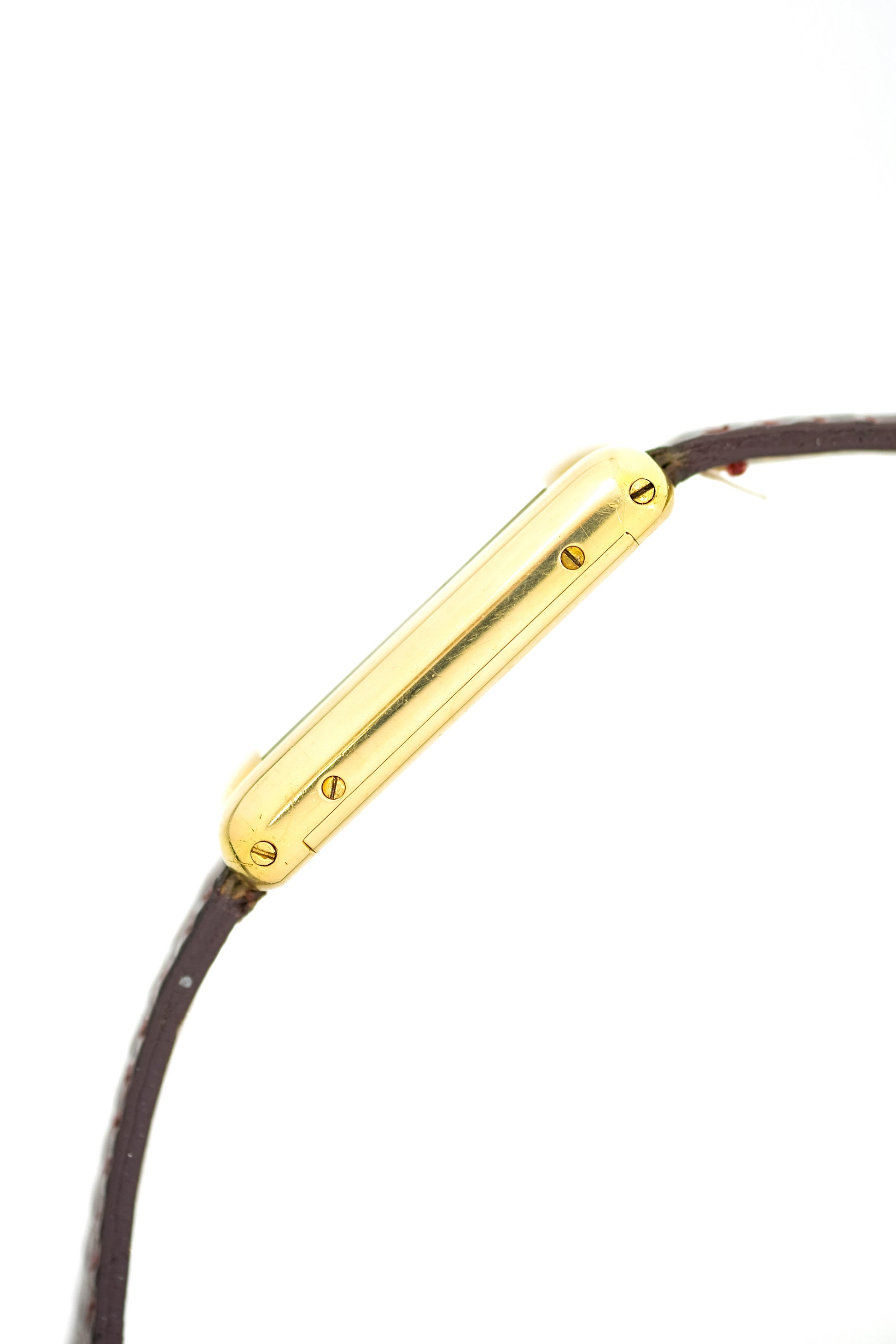 Boîtier et boucle ardillon Cartier en or jaune 18 carats. Bracelet Cartier en cuir de lézard bordeaux.