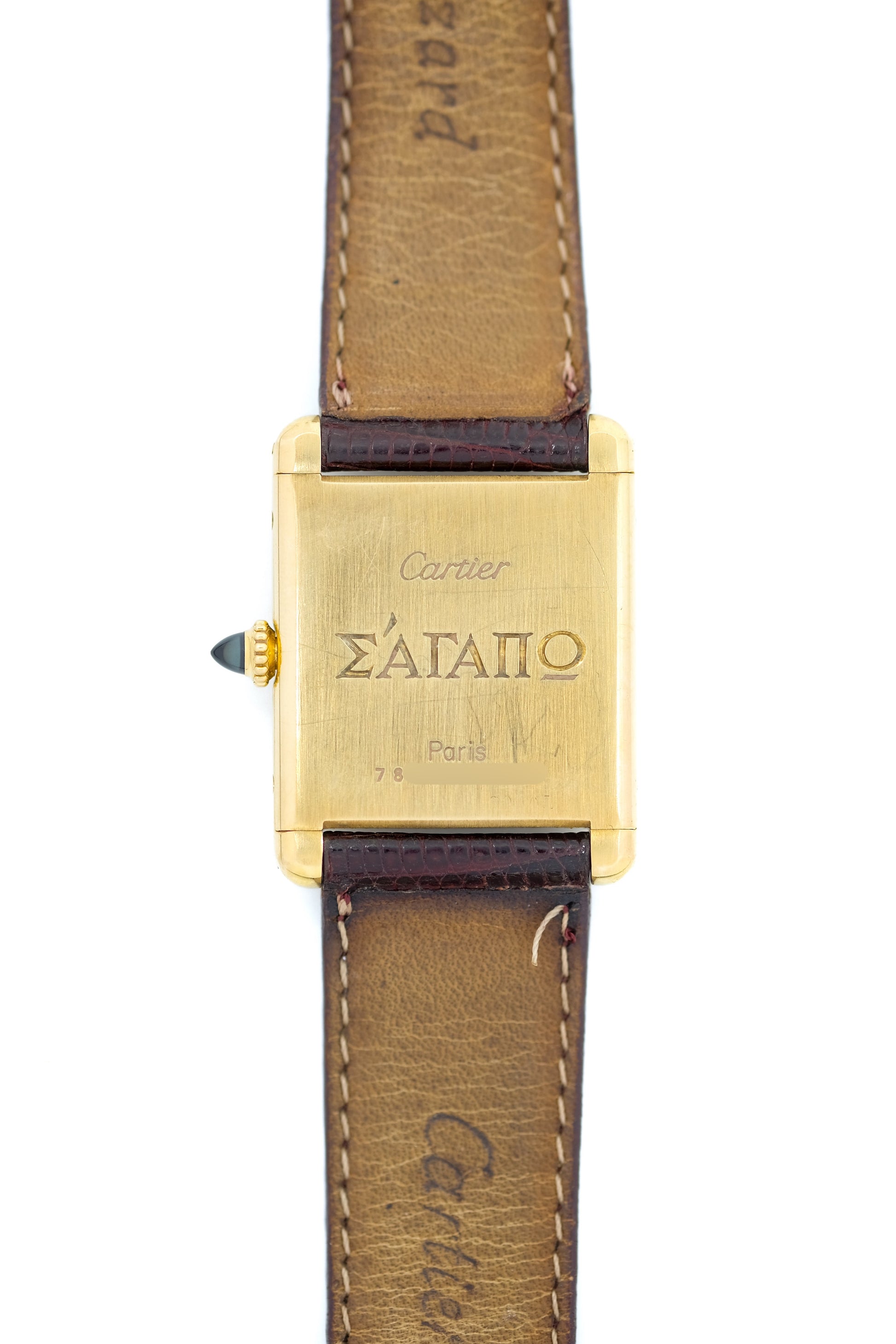 La singularité de cette Cartier Tank se trouve particulièrement au dos du boîtier où l'on peut lire une touchante déclaration gravée en grec : "Σ ΑΓΑΠΩ" signifiant "JE T'AIME" en français. Un message précieux qui rend la montre unique.