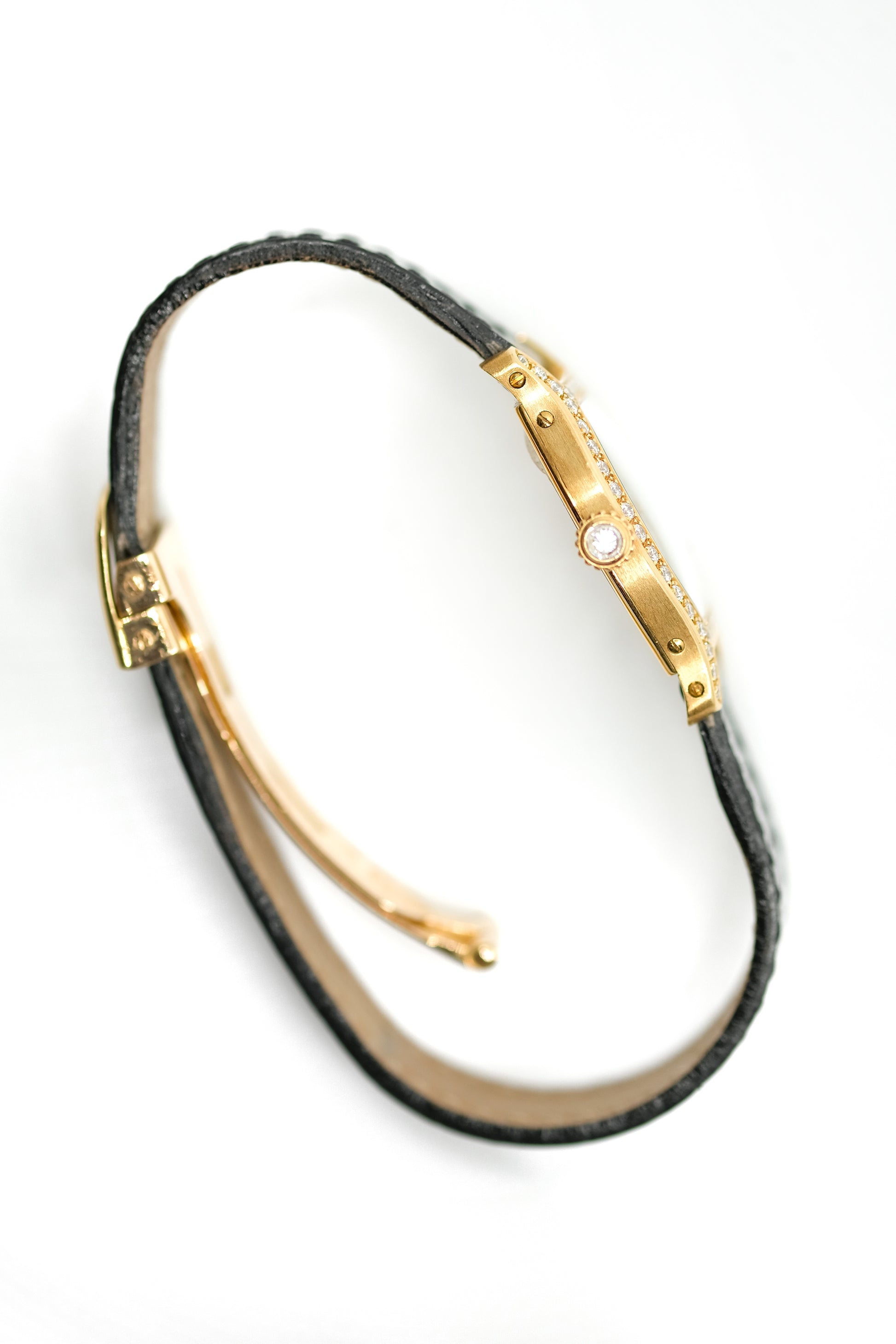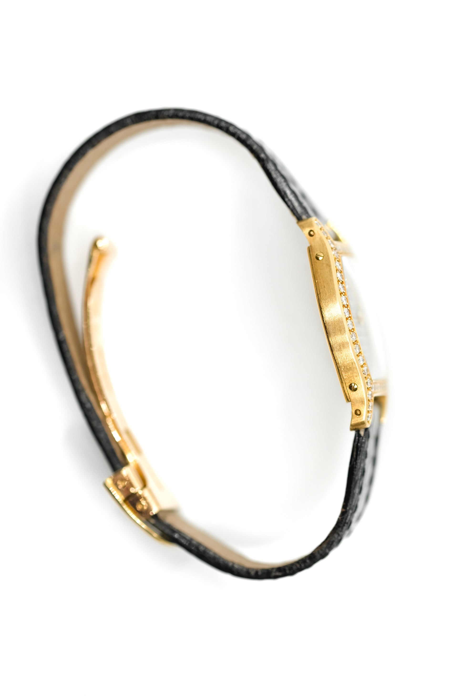 Le bracelet en cuir d'origine, sur-mesure, est monté sur une boucle déployante en or jaune : confort et esthétisme sont de mises ! La montre précieuse que l'on porte presque comme un bijou.