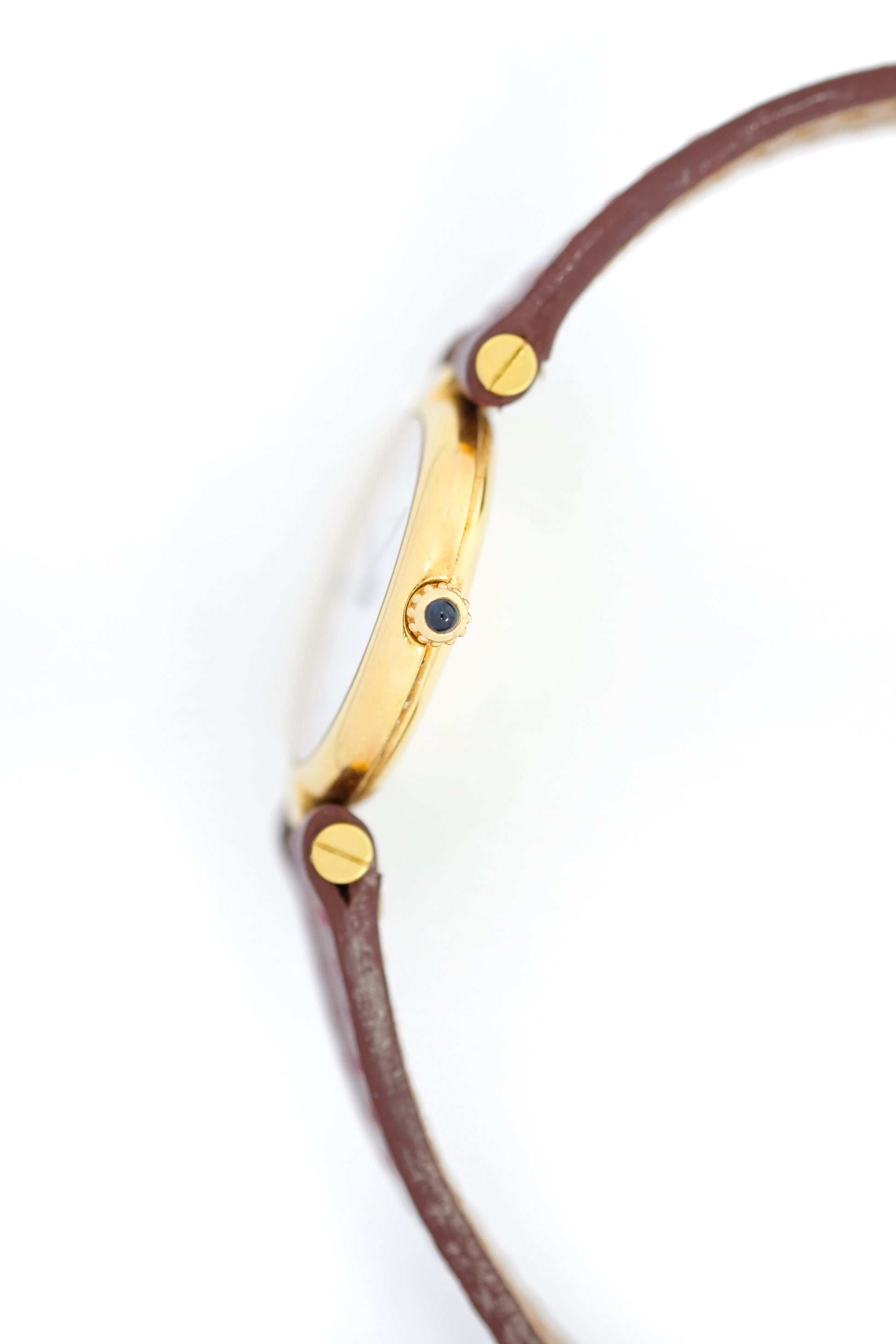 Boîtier en or jaune 18 carats. Bracelet en cuir de veau bordeaux. Boucle ardillon Cartier plaquée or. Écrin et papiers d'origine.