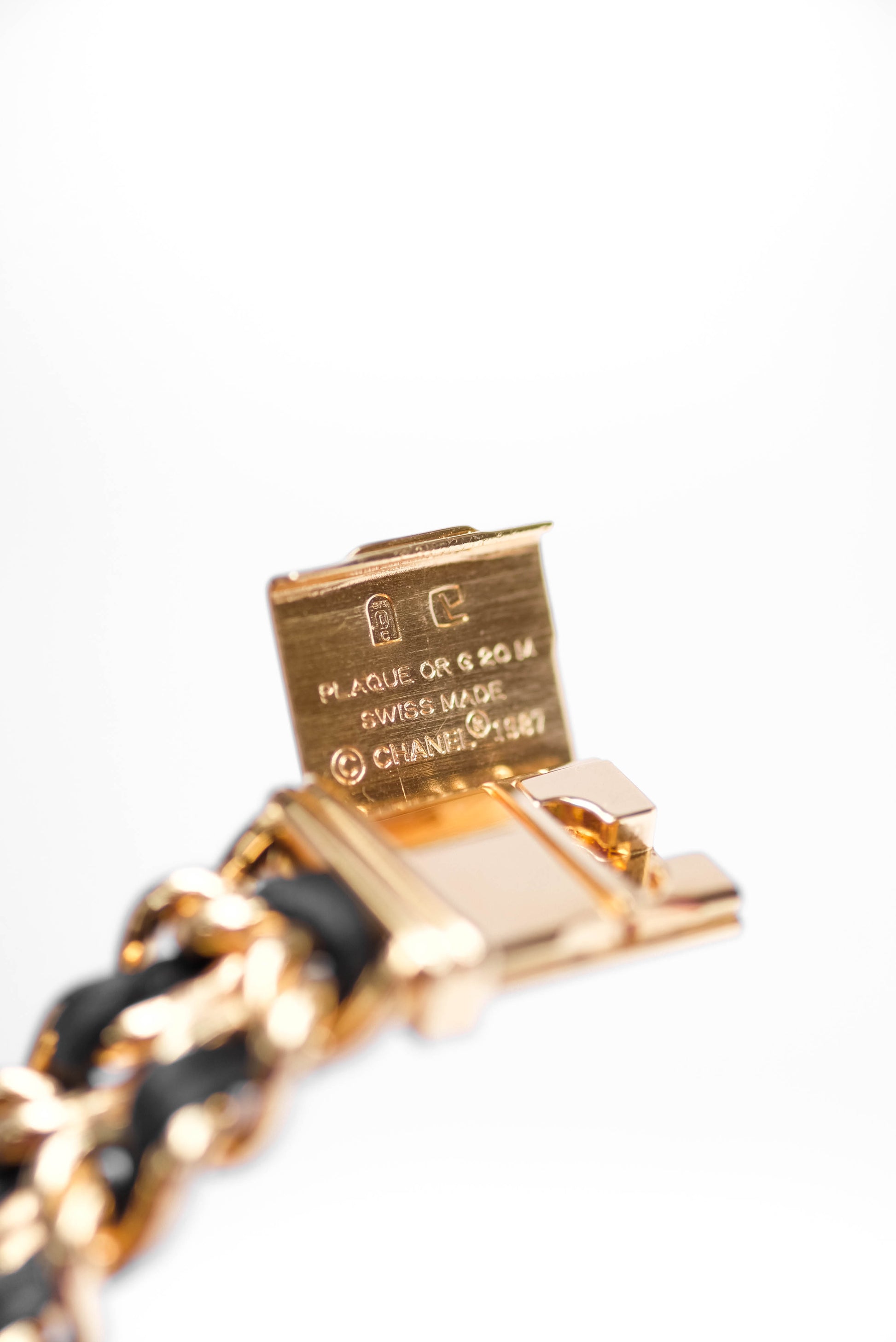 La Chanel Première est un véritable bijou au poignet, surtout dans cette version plaquée or. La version la plus connue serait sûrement ce modèle sur bracelet maille et cuir, désigné comme "chaîne iconique" chez Chanel. Un jeu de lignes et de courbes entre le boîtier et le bracelet dont les mailles arrondies, mêlées à la lanière de cuir, rompent avec les traits francs de la montre. Le boîtier et la maille plaqués or donnent au modèle un aspect assez élégant et habillé, même si le cuir casse les codes par son côté rock.