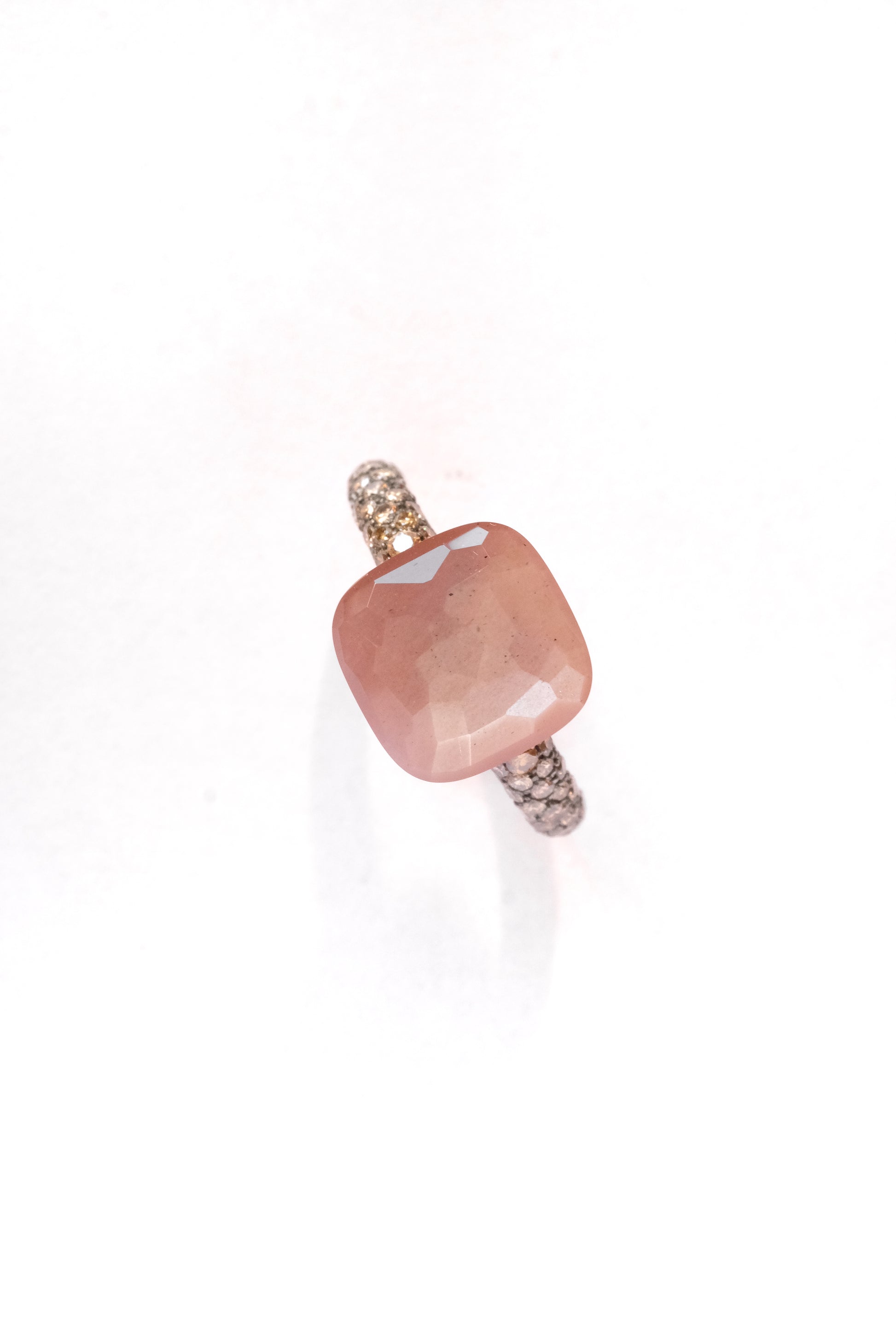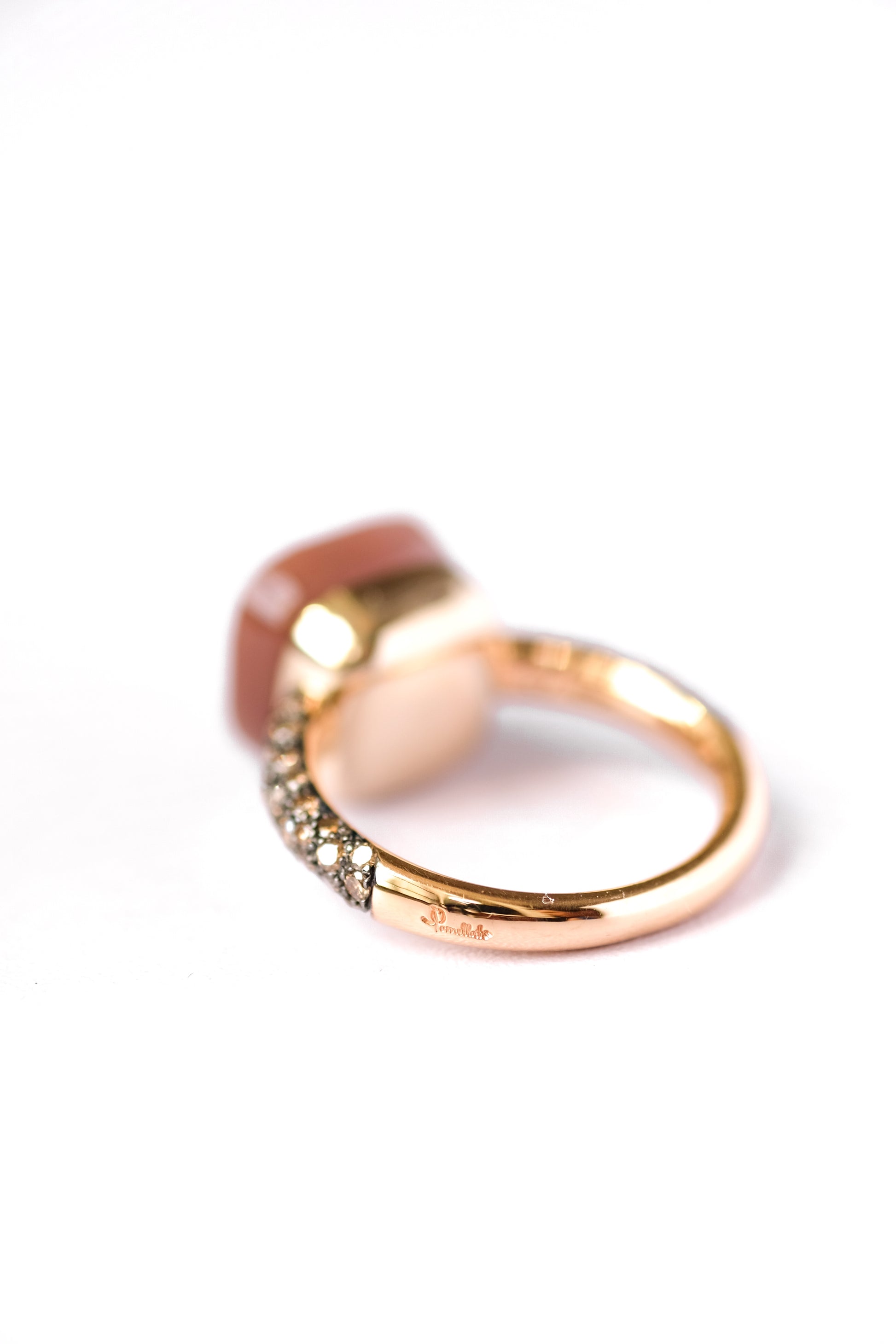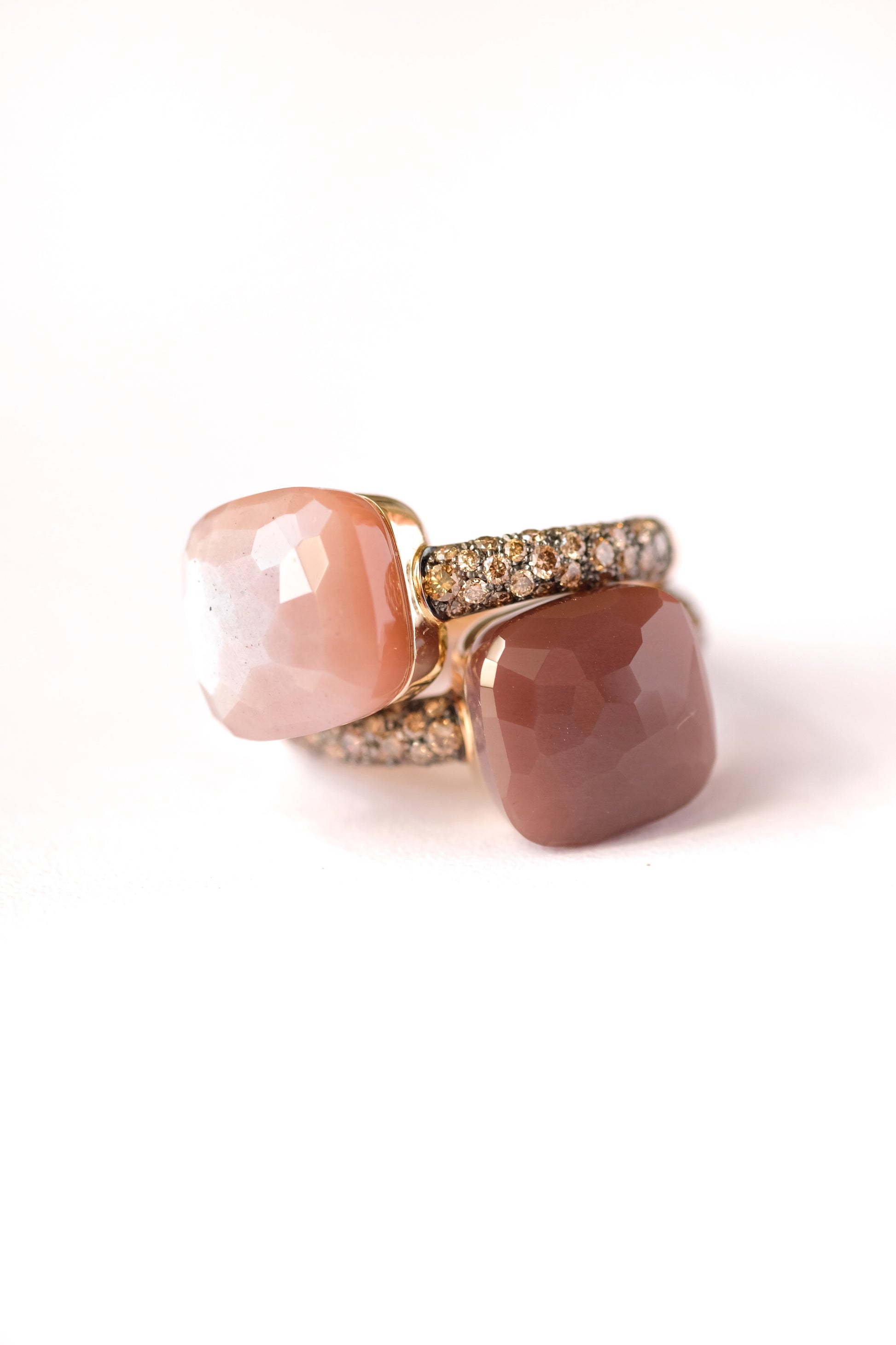 La collection Nudo met en scène une multitude de gemmes aux couleurs intenses, des pierres singulières comme la pierre de lune de cette bague. "Nudo" signifiant "nu" en italien, Pomellato présente ici des bijoux épurés dont la pierre, dépourvue de griffe, semble flotter sur son piédestal. En effet, le système de fixation caché à l’intérieur du chaton maintien la base de chaque pierre. Inspirées d'un cabochon, elles sont sublimées par leurs 57 facettes sur lesquelles la lumière semble danser. Ainsi, c'est la pierre qui joue le rôle central. Elle peut être accompagnée, comme sur ce modèle, d'un anneau en or 18 carats serti de diamants. Le dégradé de brun de ces derniers répond parfaitement à la pierre de lune tout en lui donnant un éclat supplémentaire.