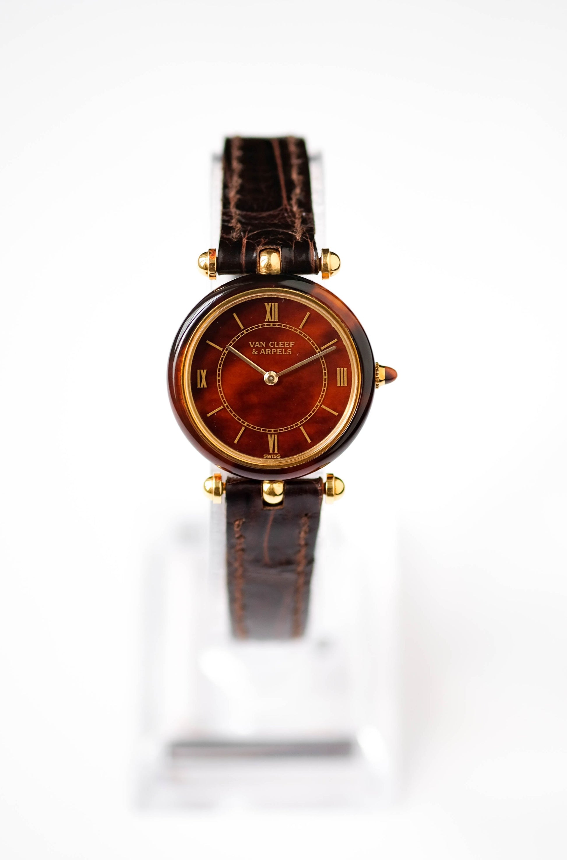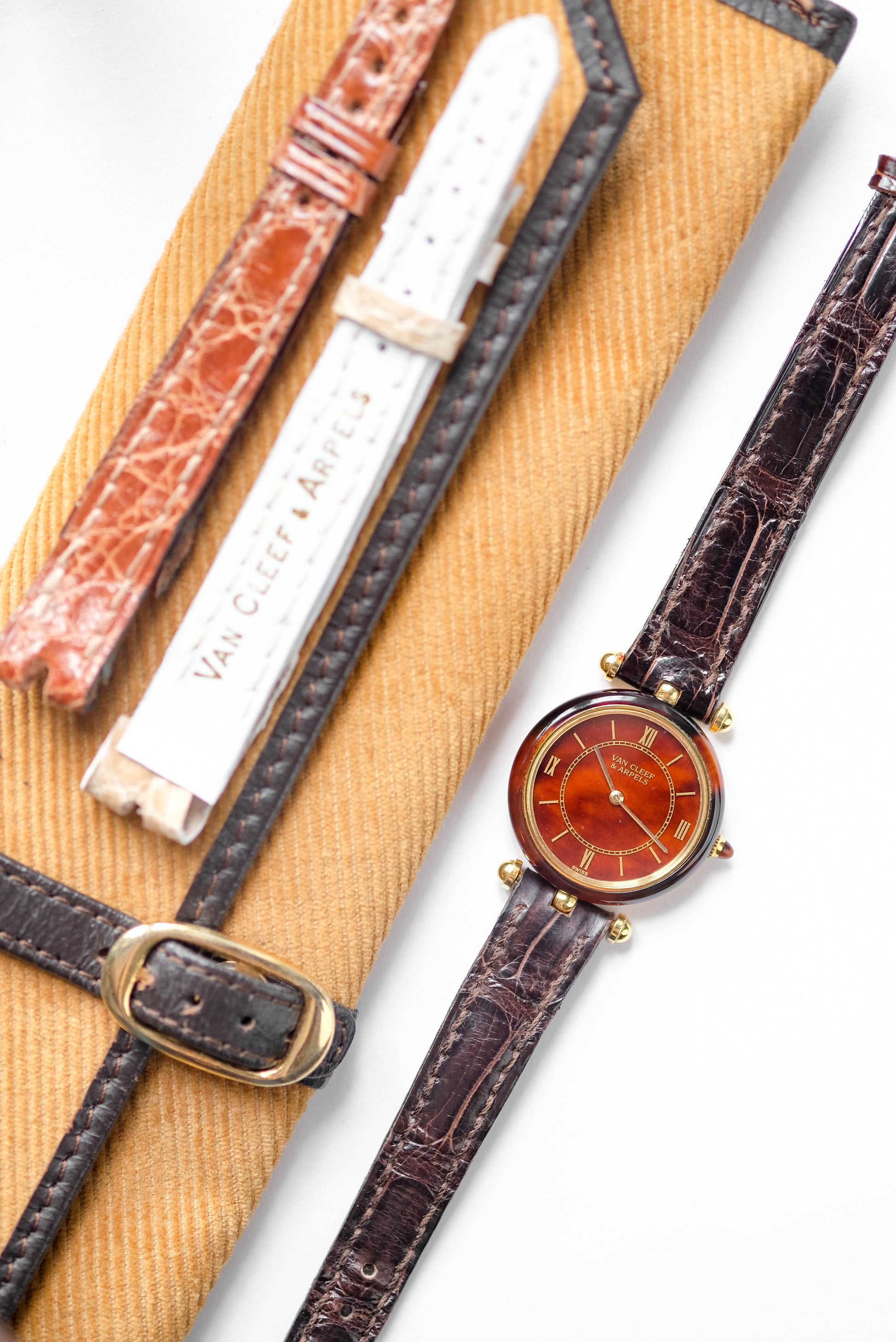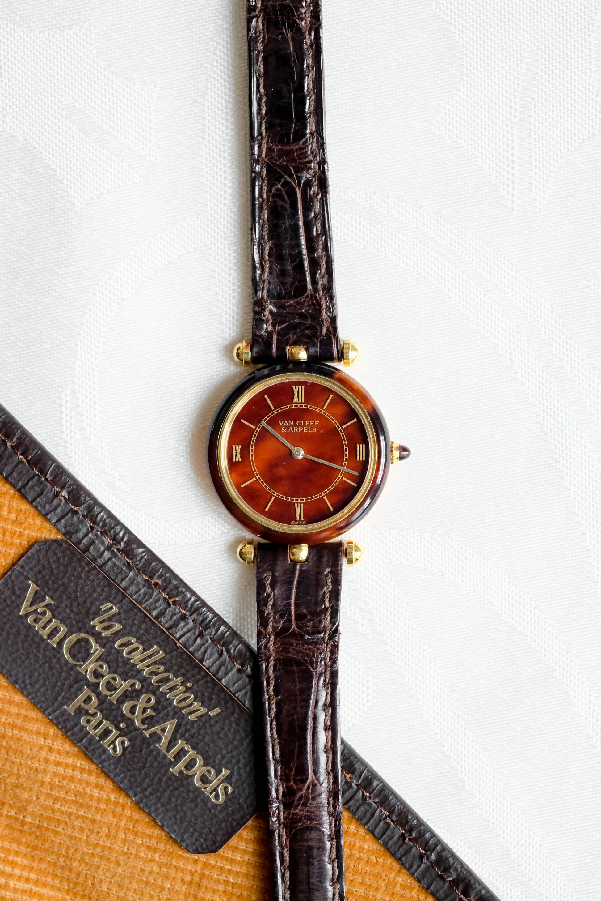 Boîtier en or 18 carat et écaille de tortue / boucle ardillon VCA en or jaune 18 carats / Vient avec une pochette et deux bracelets cuir Van Cleef & Arpels